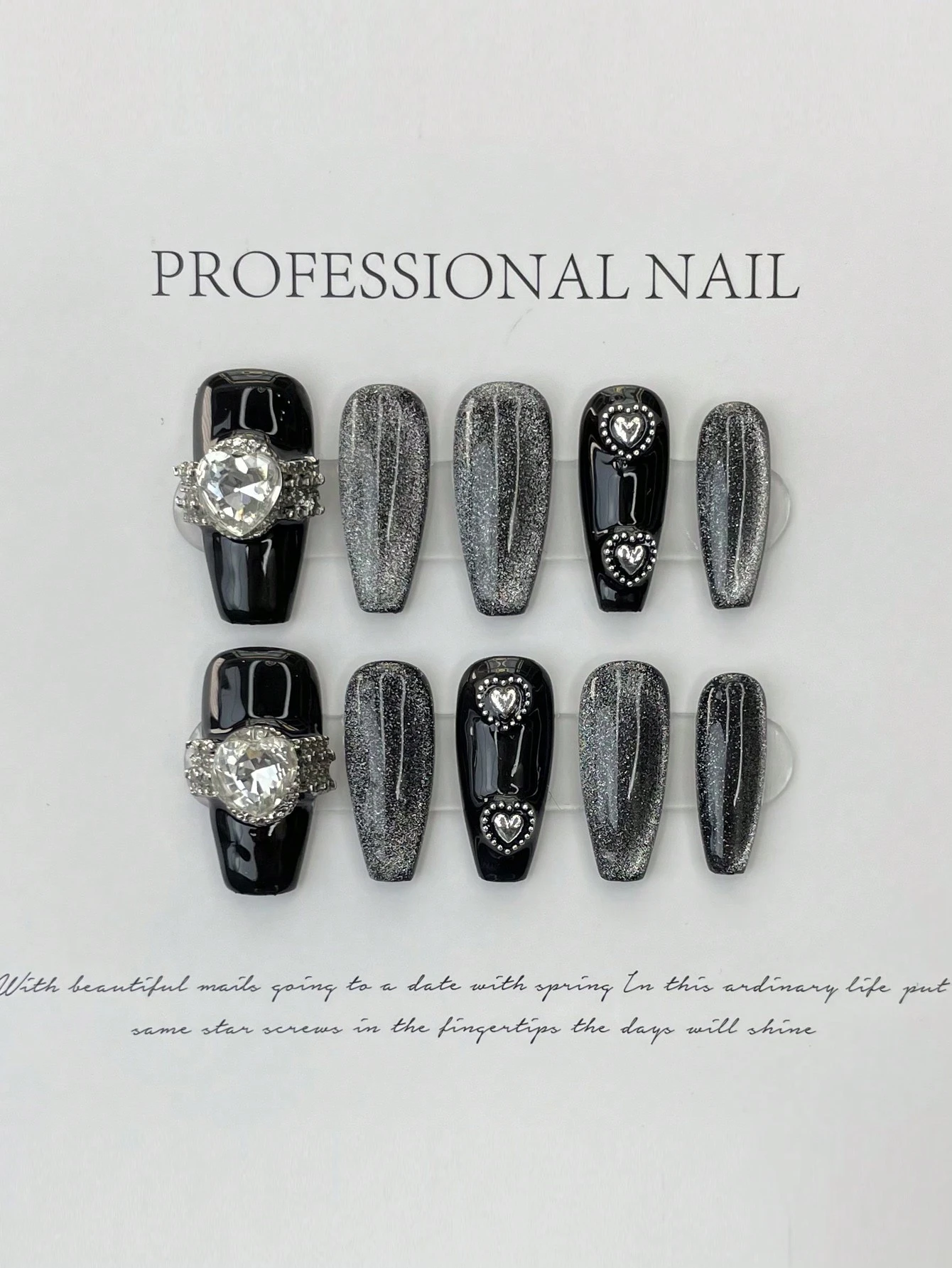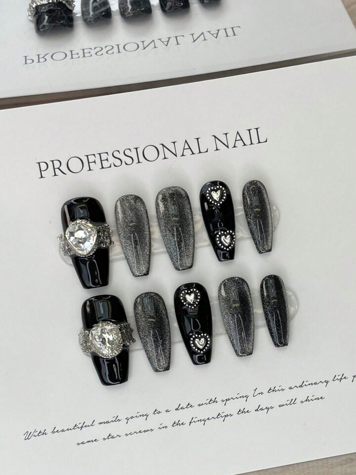 Goth 10pcs Long Coffin Rhinestone Decor Fake Nail Kit