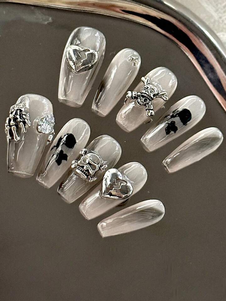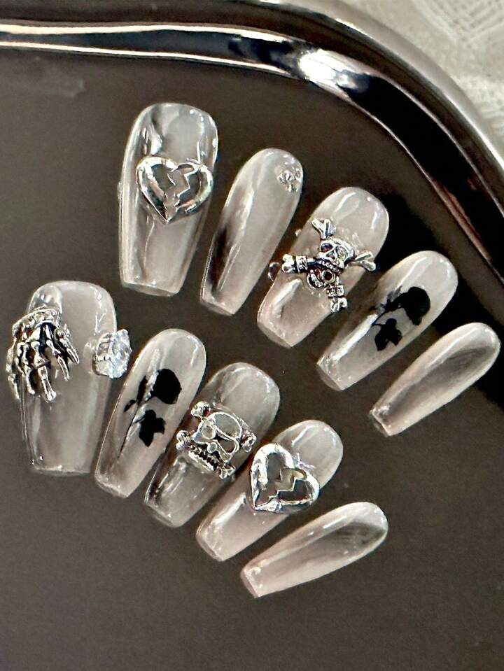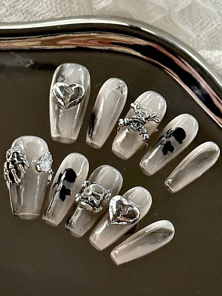 Goth 10pcs Long Press-on Nails Set With Midnight Poet Design, Including Jelly Glue