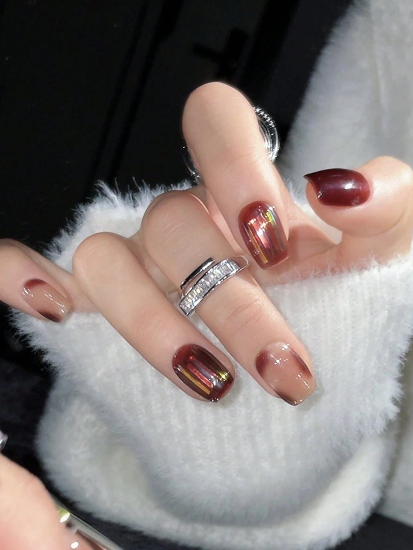 Goth 10pcs/Set High-Grade Burgundy Faux Nails With Maple Leaves Design, Detachable And Full Coverage