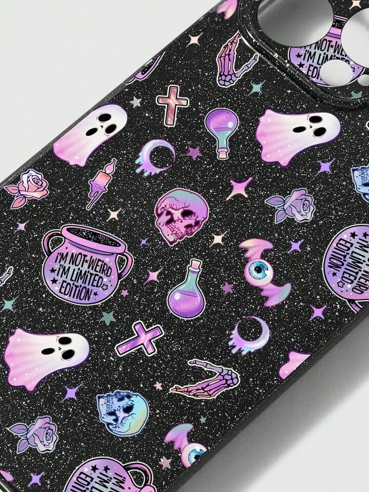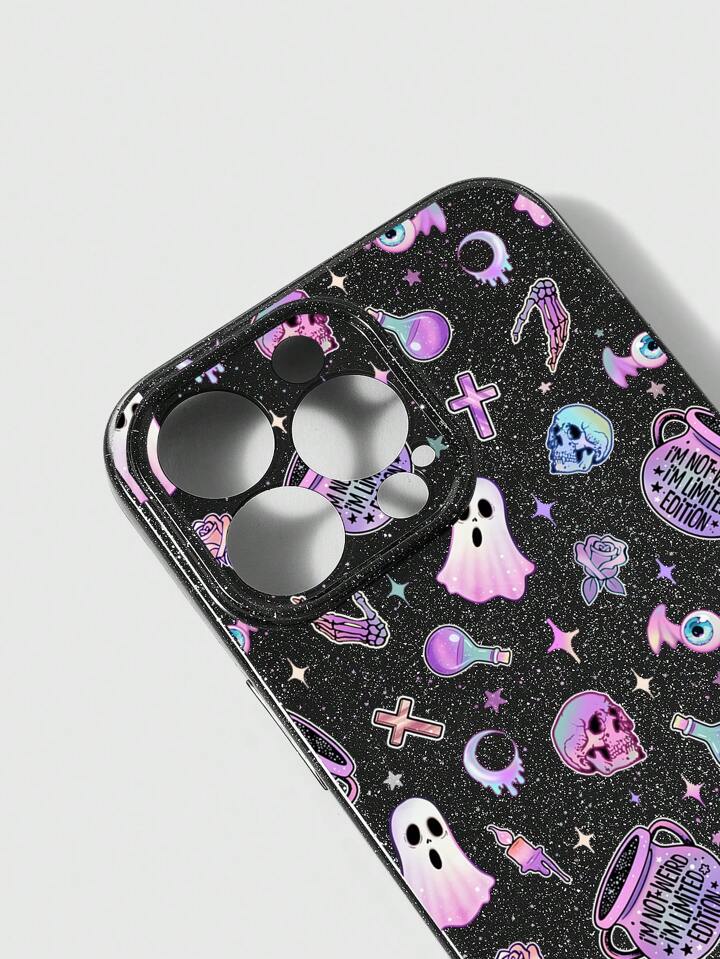 Goth 1pc Black Shiny Glitter Phone Case With Skull Rose, Ghost, Camellia Flower, Bow Tie Design, Compatible With Iphone 11 12 13 14 15 Pro Max, Halloween