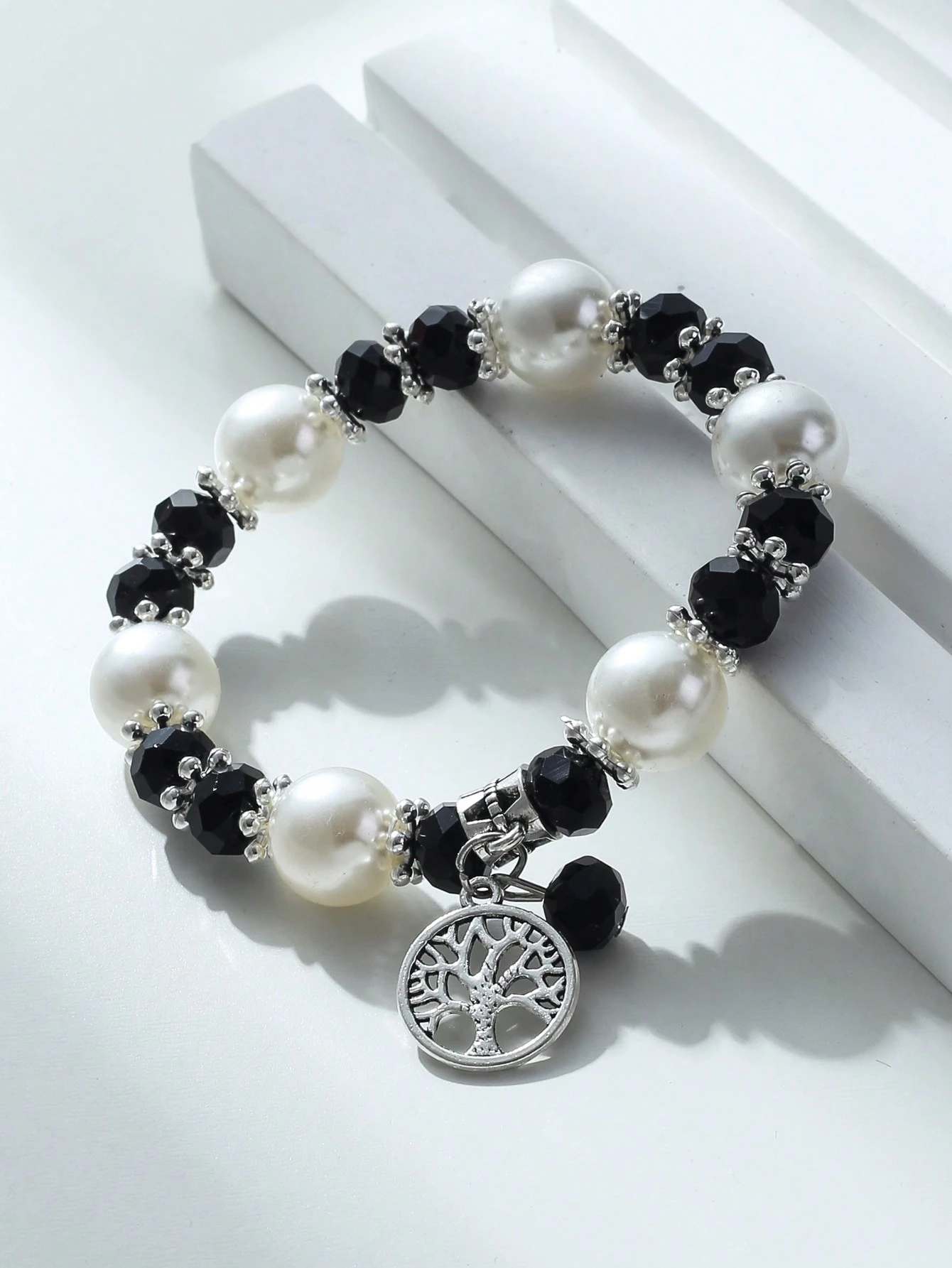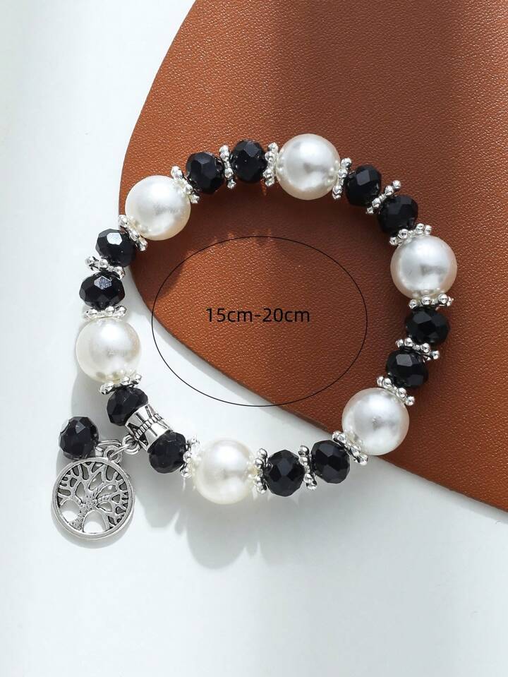 Goth 1pc Fashionable Minimalist Elastic Beaded Bracelet With Pearl, Rhinestone & Tree Of Life Charm
