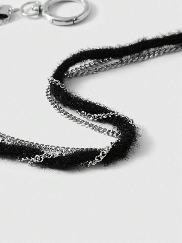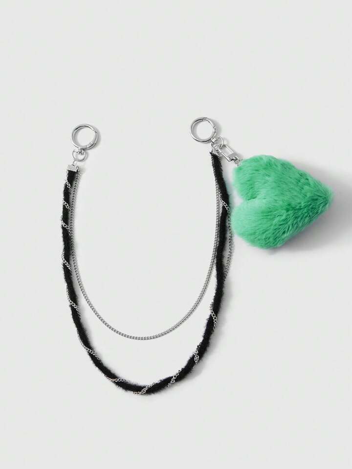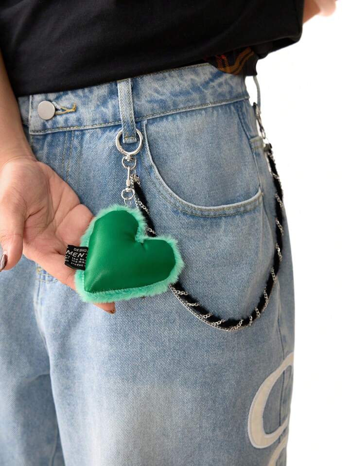Goth 1pc Fashionable Versatile High-Quality Silver Chain Black Plush Green Leather 3D Heart Shaped Waist Chain/Belt For Women, Suitable For Daily Wear Or Festive Gift