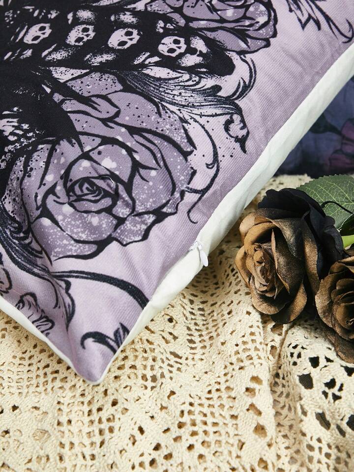 Goth 1pc Skull & Floral Print Cushion Cover Without Filler,Dark Washable Decorative Square Pillowcase