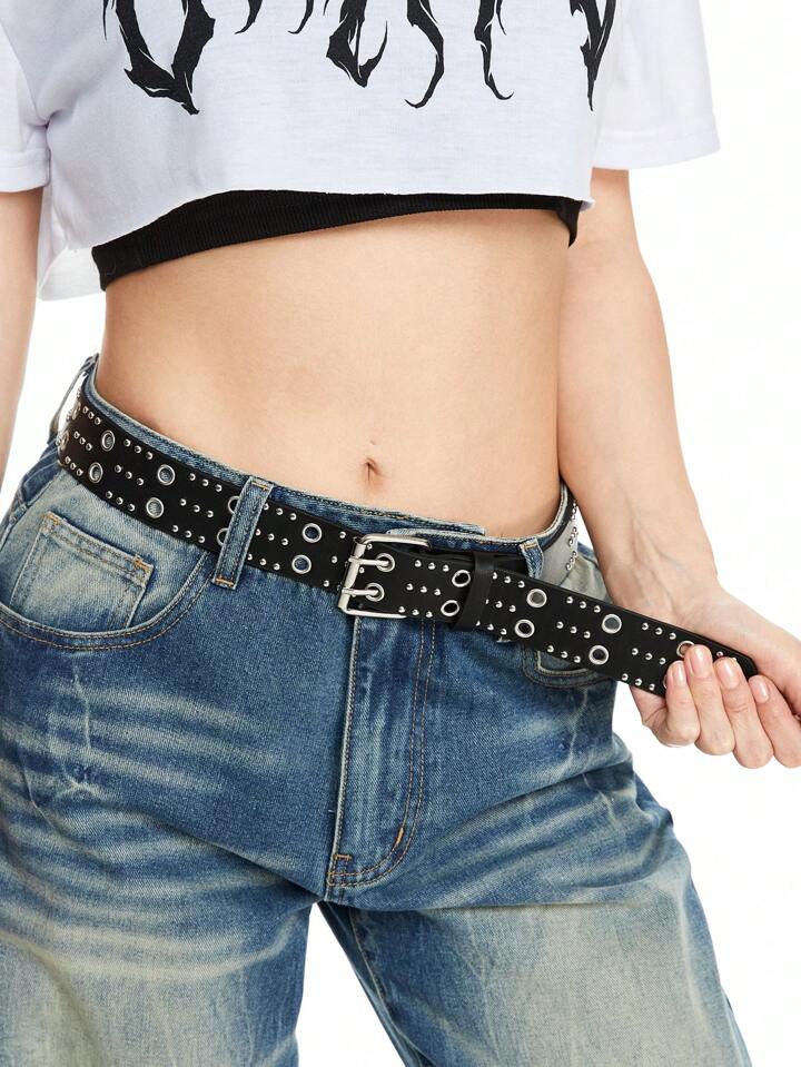 Goth 1pc Women's Black Punk Style Rivet Double Air Vent Buckle Waist Belt Jeans Accessories, Daily Versatile