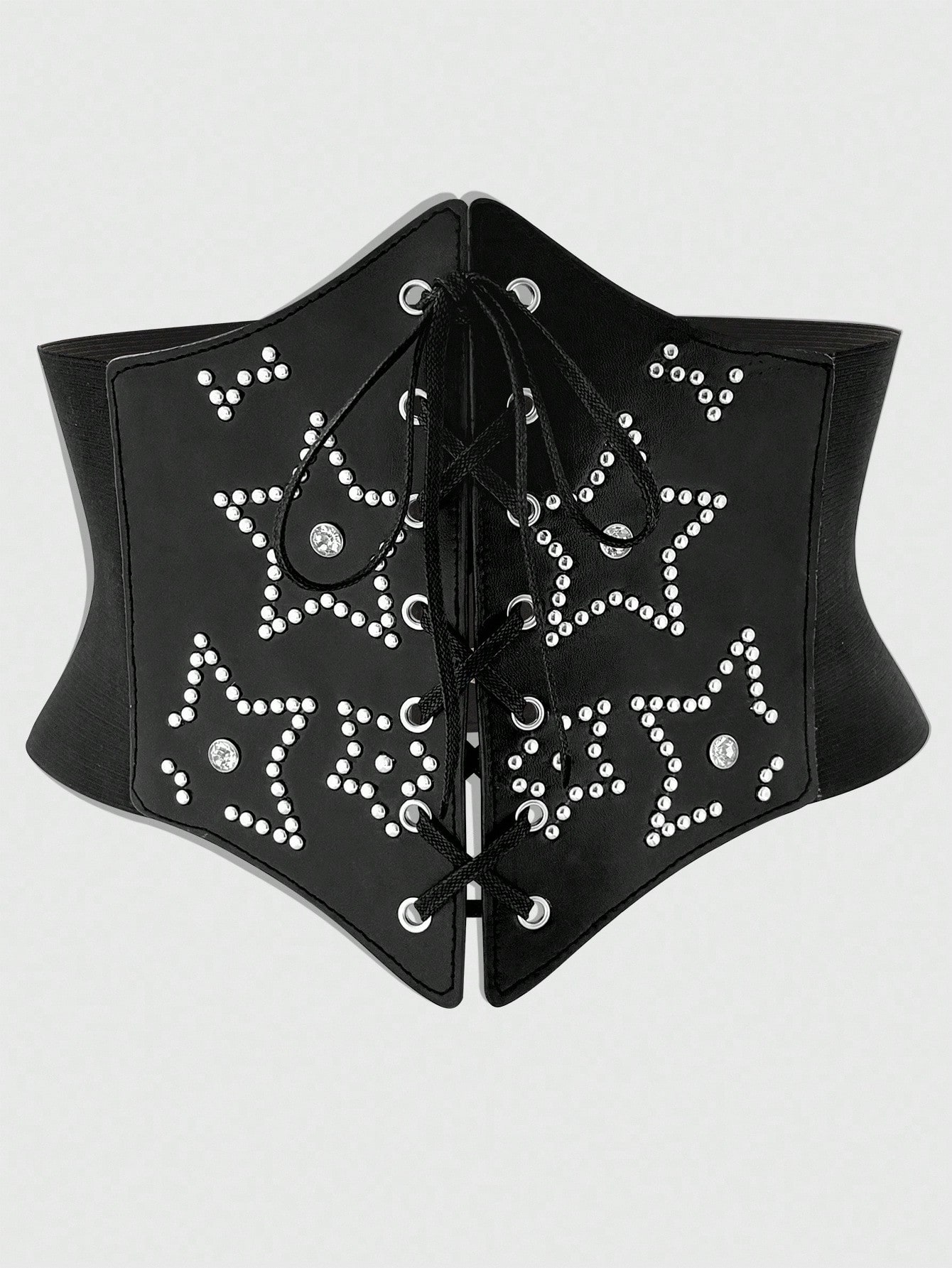 Goth 1pc Women's Black Rivet & Rhinestone Pentagram Decor Elastic Drawstring Waist Belt, Punk Style Hexagon Waist Cincher Dress Accessory, Versatile For Halloween & Daily Wear