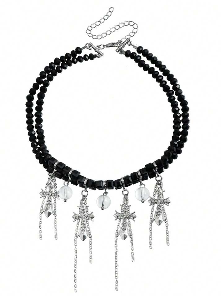 Goth 1pc Women's Sweet & Edgy Double Layer Crystal Bead Rhinestone Cross & Glass Ball Tassel Necklace