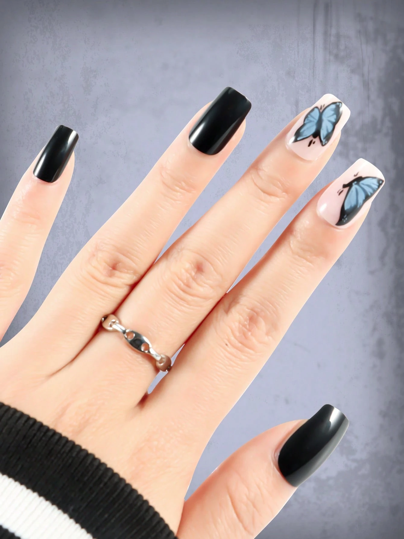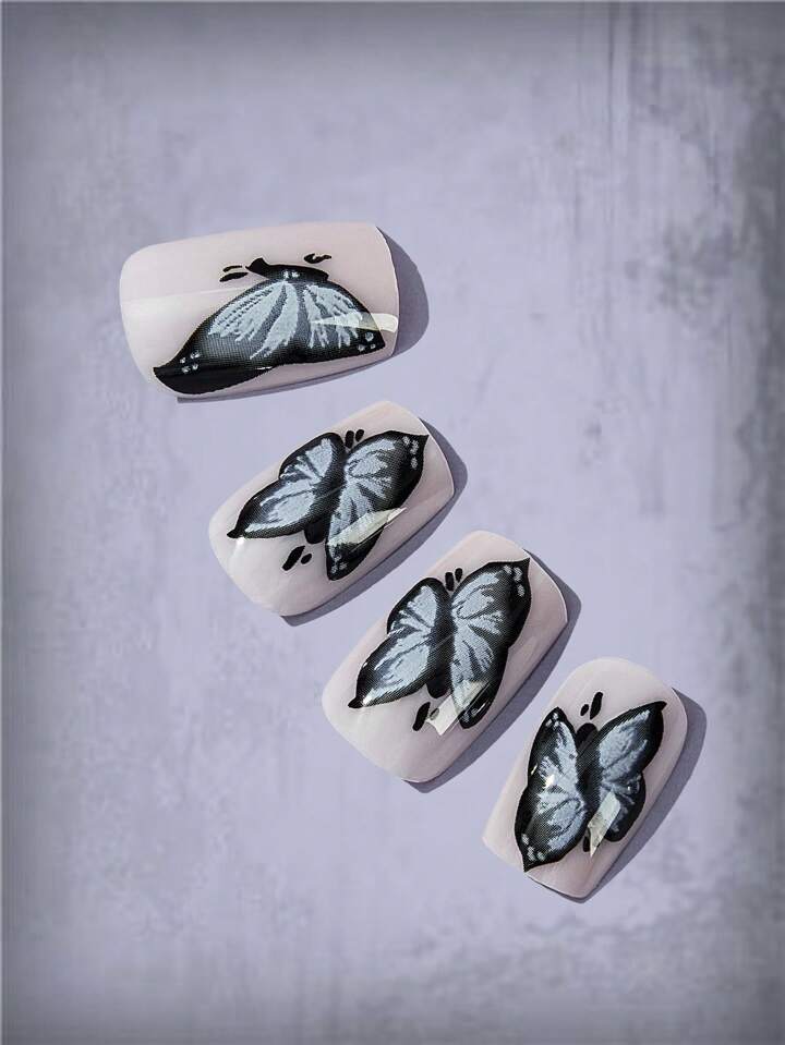 Goth 24pcs Square Butterfly Print Fake Nail & 1sheet Tape