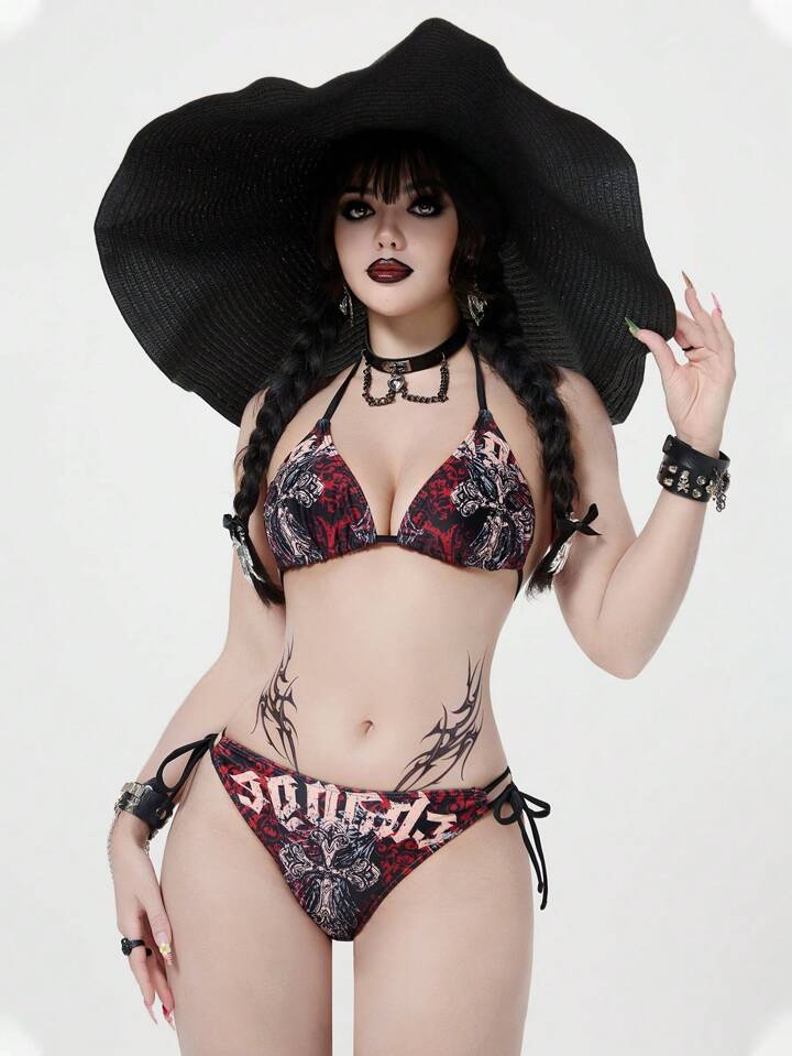 Goth 2pcs Women Punk Cross Decor Maroon & Black Bikini Set, Casual For Beach Party Holiday, Halloween