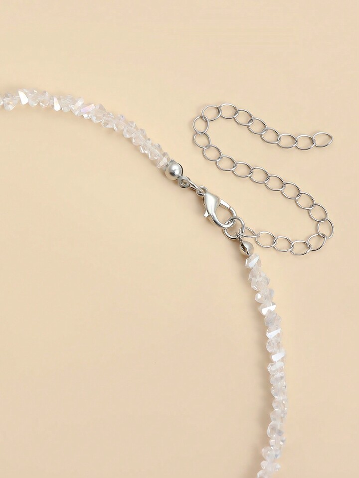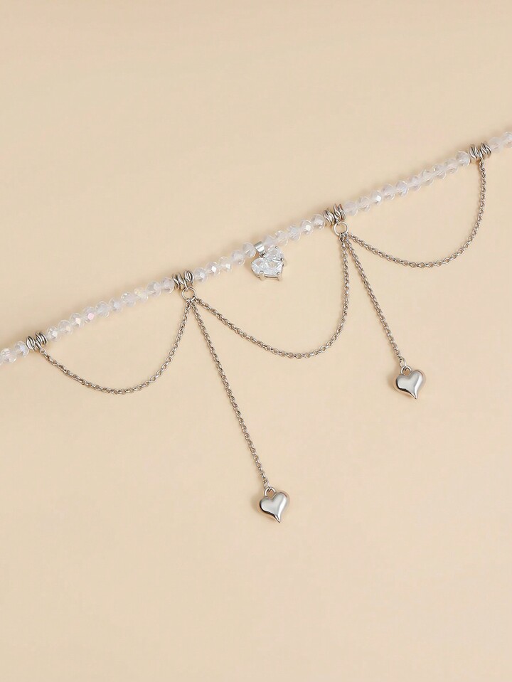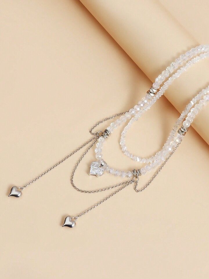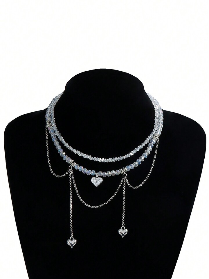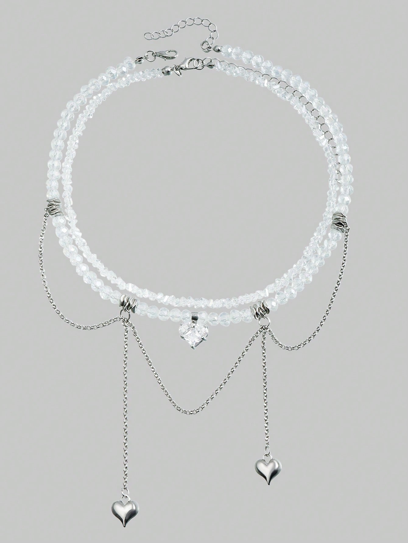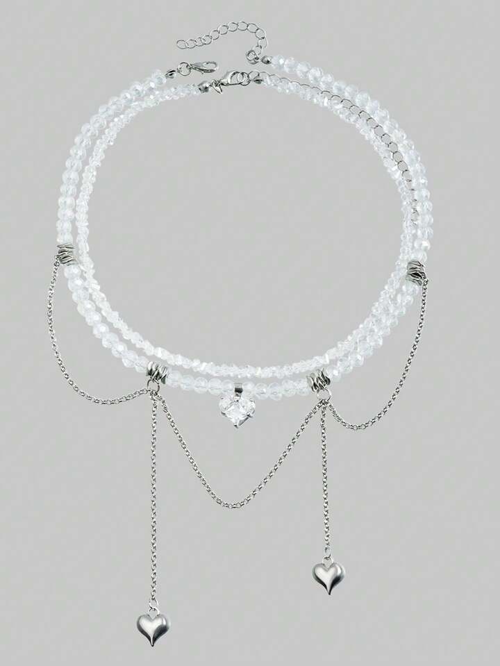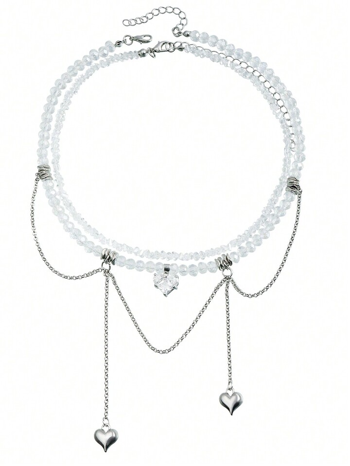 Goth 2pcs Women's Double-Layer Stacked Heart Zirconia Double Chain Tassel Choker Necklace Set