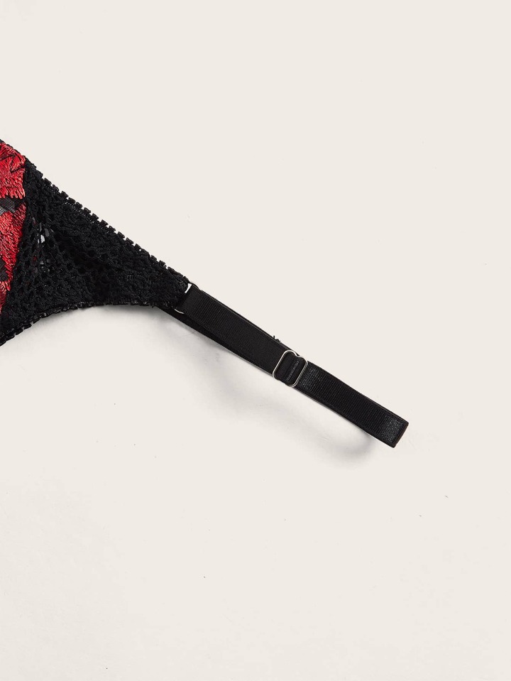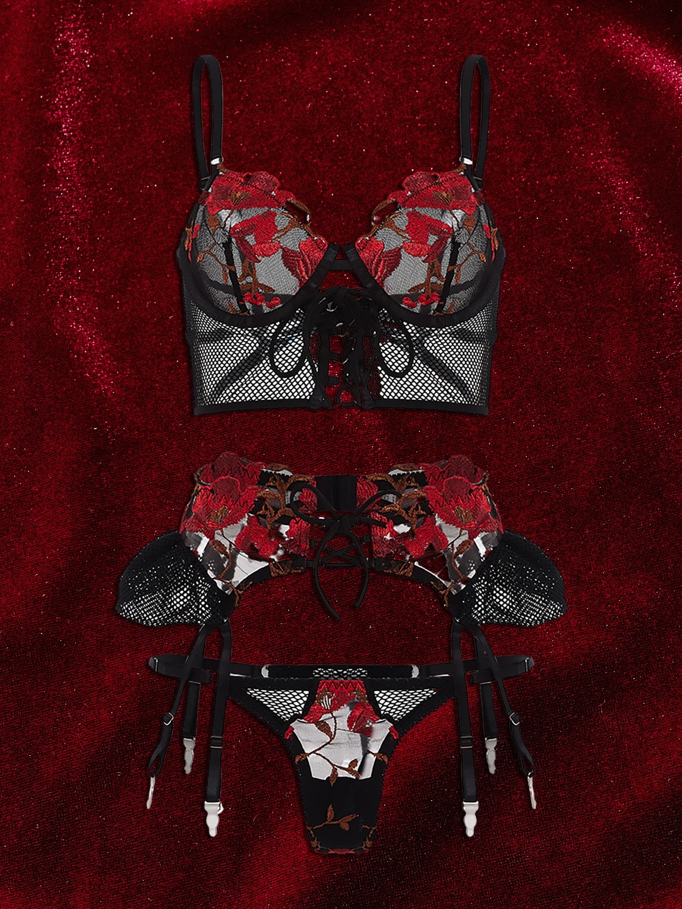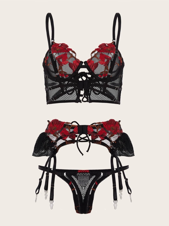 Goth 3pack Floral Embroidery Mesh Underwire Garter Lingerie Set
