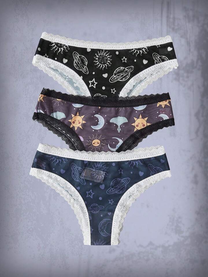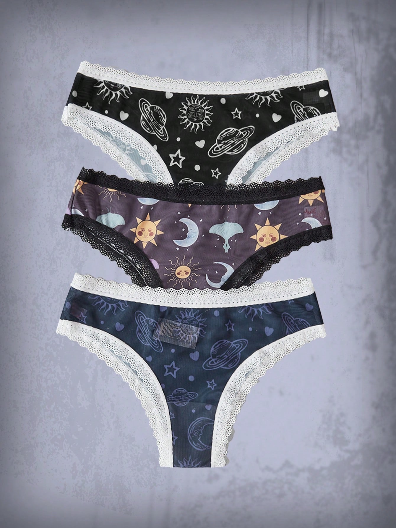 Goth 3pack Sun & Moon Graphic Contrast Lace Brief Set