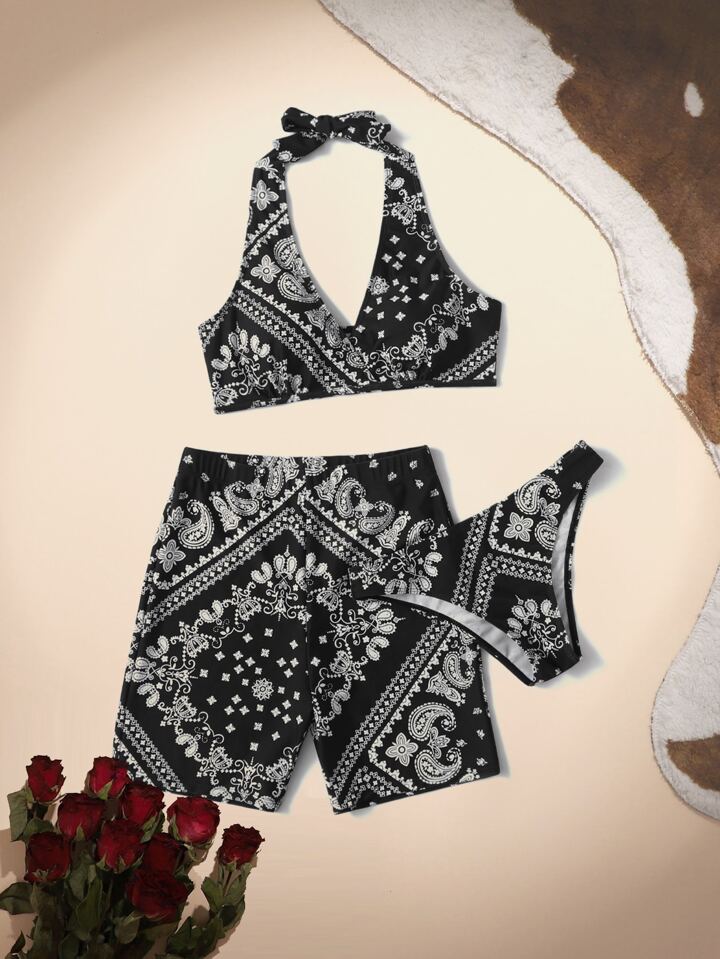 Goth 3packs Baroque Print Halter Bikini & Swim Shorts