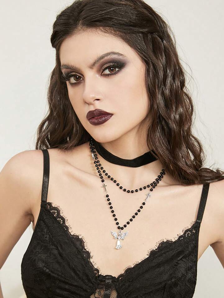 Goth 3pcs Funky Cross & Wings Beaded Charm Necklace For Women For Daily Decoration