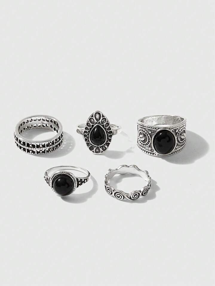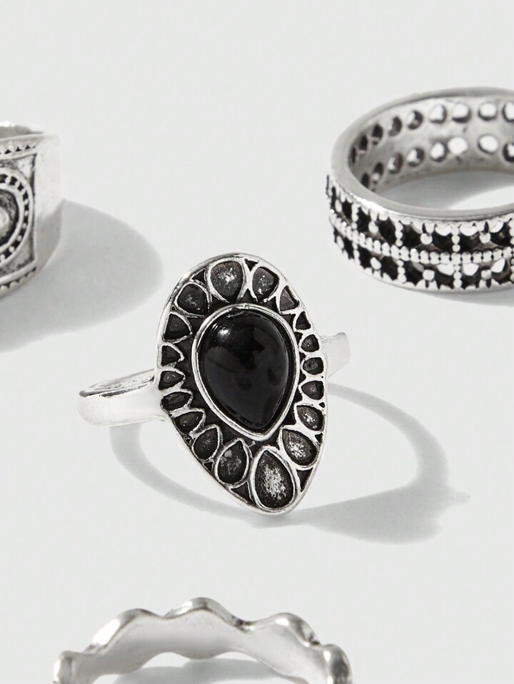 Goth 5pcs/set Vintage Gemstone Teardrop Design Ring Set