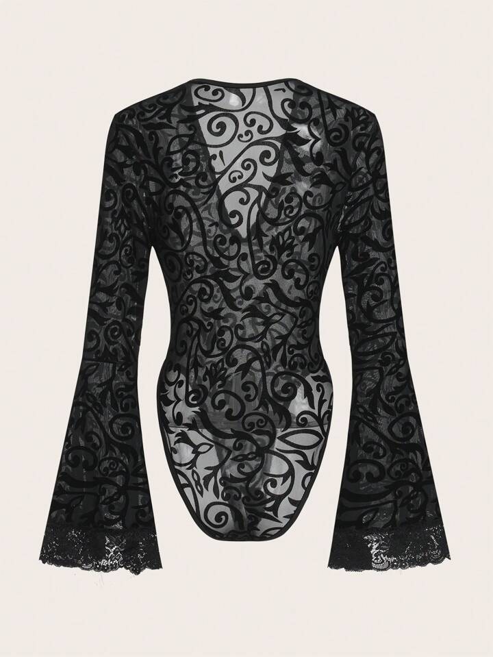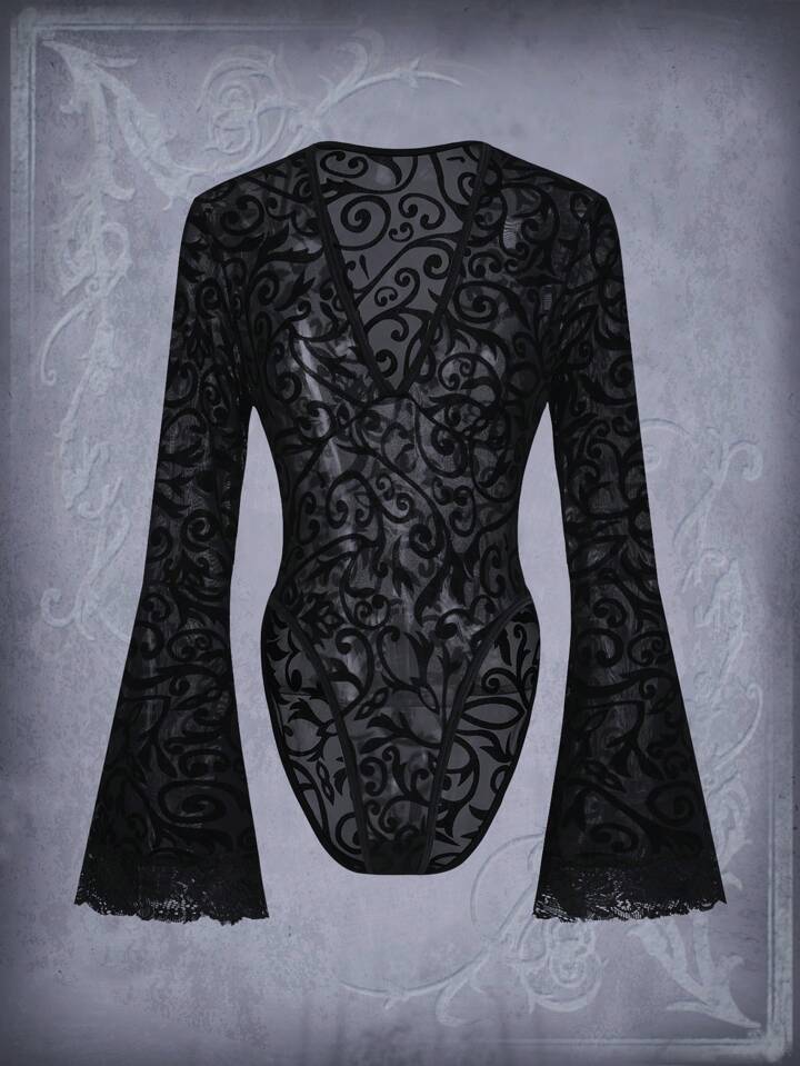 Goth All Over Print Flounce Sleeve Mesh Bodysuit