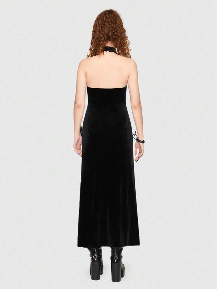 Goth Backless Split Thigh Velvet Halter Dress Without Gloves