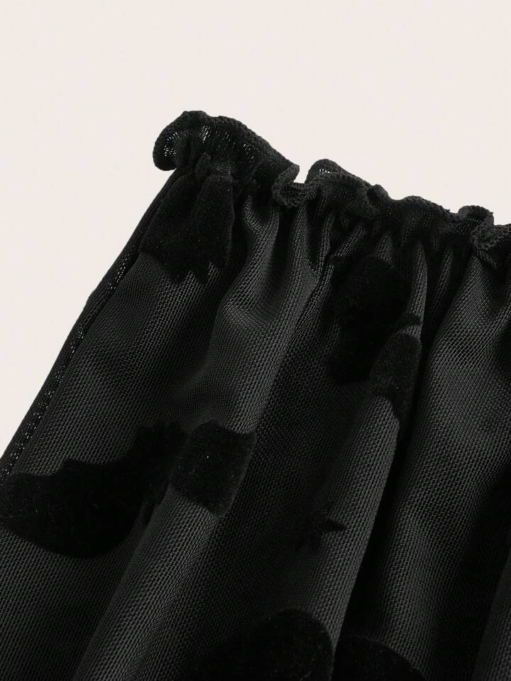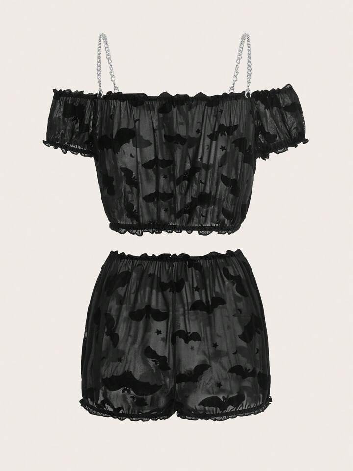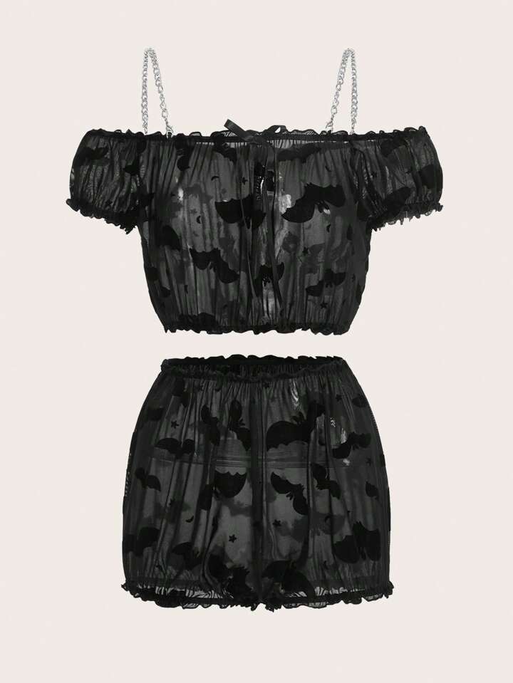 Goth Bat Print Chain Detail Lettuce Trim Mesh Lingerie Set