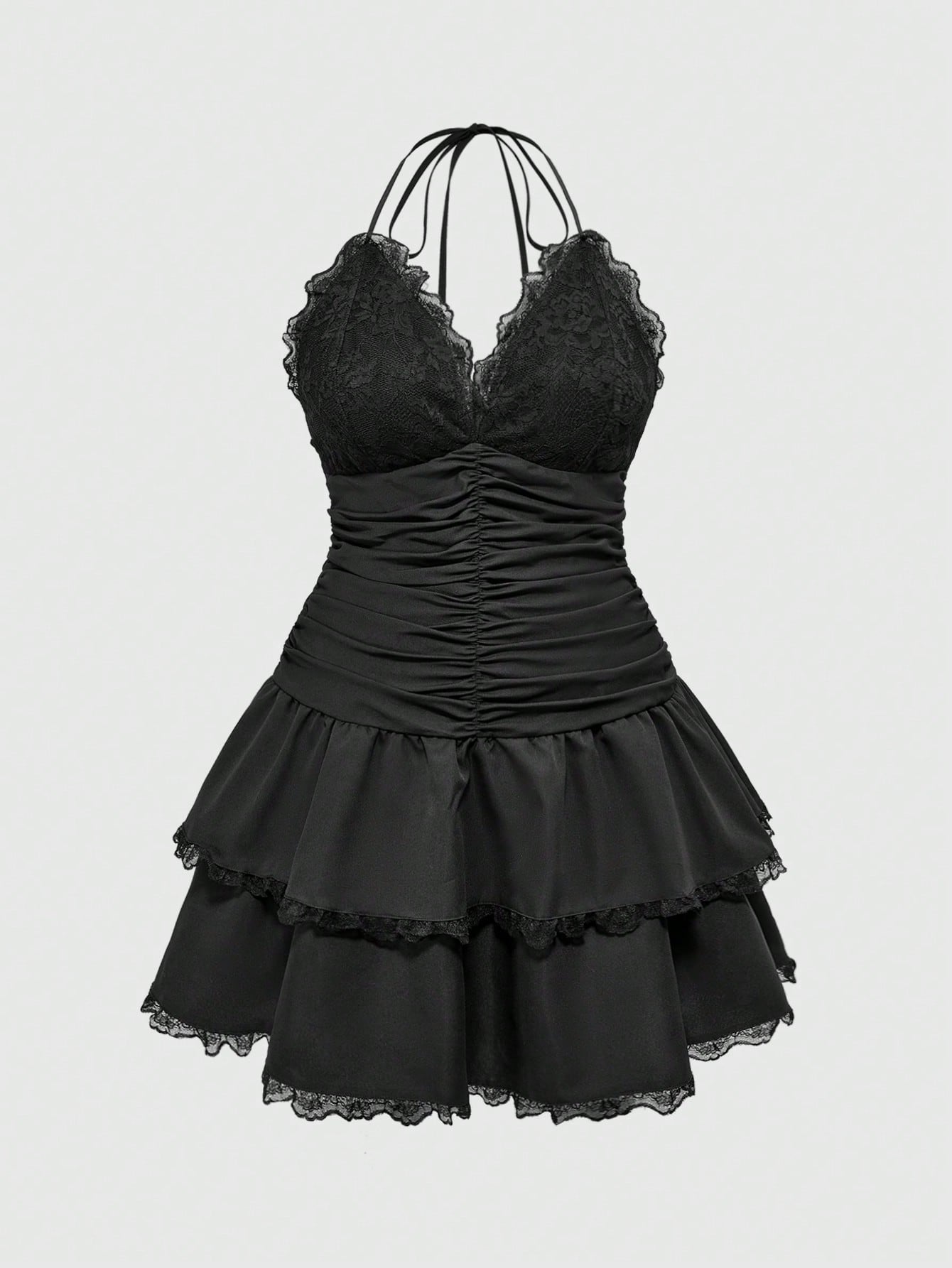 Goth Black Knit Woven Splice V-Neck Backless Ruched Double Ruffle Hem Halter Bodycon Mini Dress, Elegant & Casual For Women Plus Size, Spring & Summer