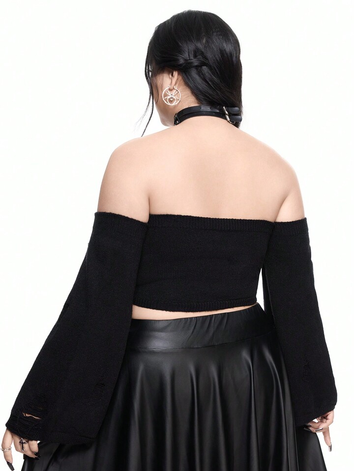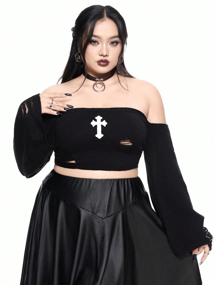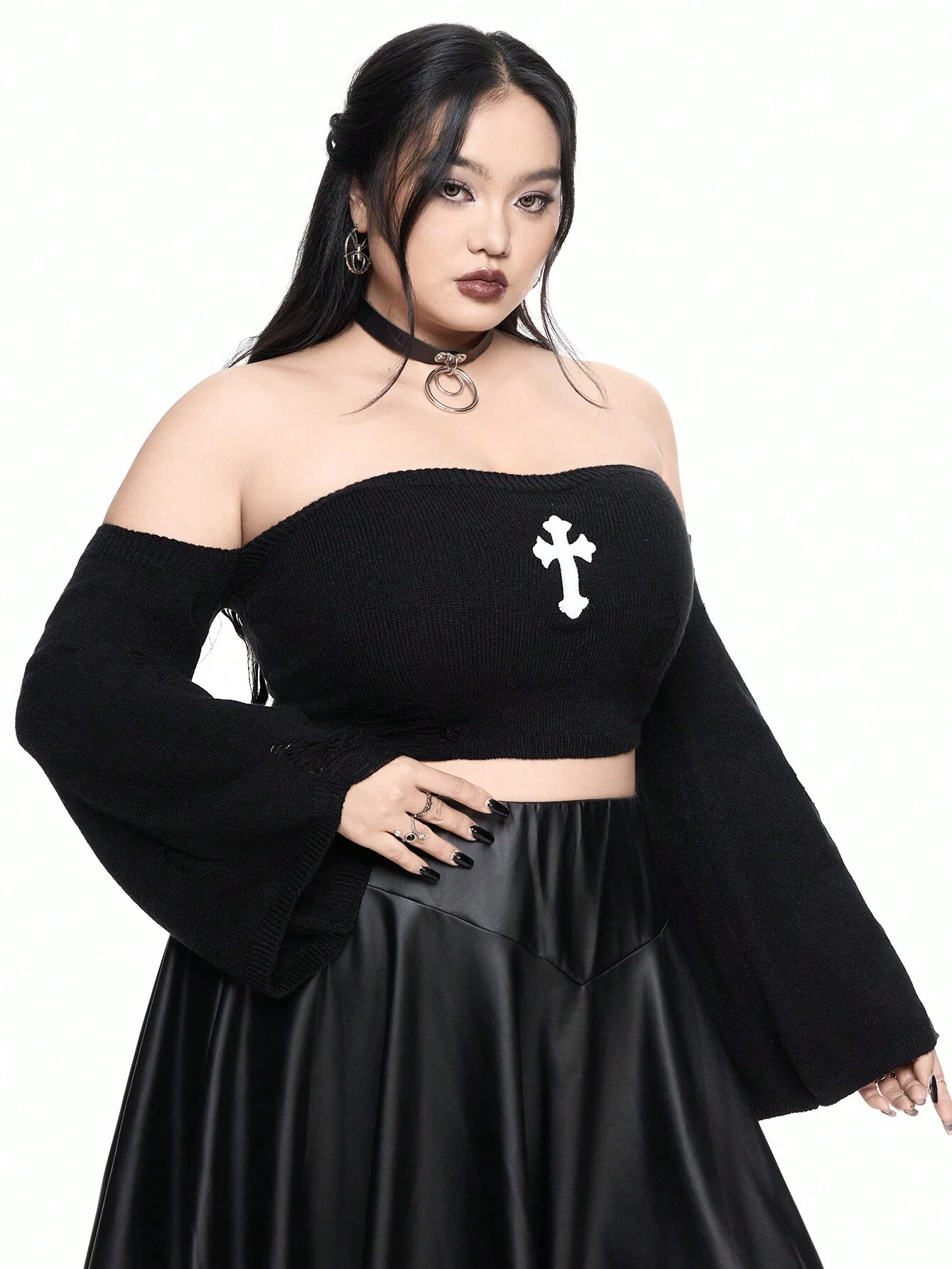 Goth Boho Chic Strapless Cuff Cross Embroidery Ripped Loose Pullover Knit Top, Plus Size