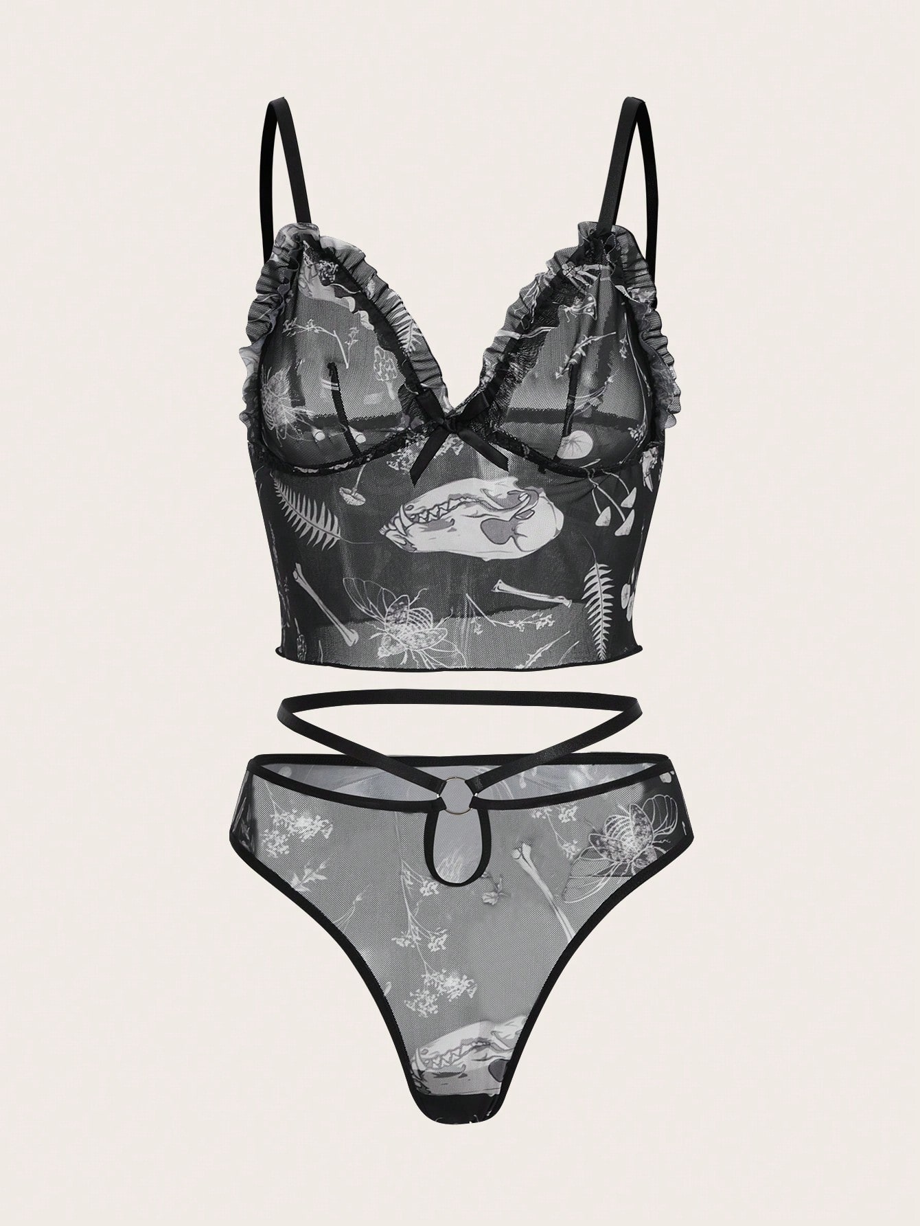 Goth Bones Print Frill Trim Mesh Lingerie Set