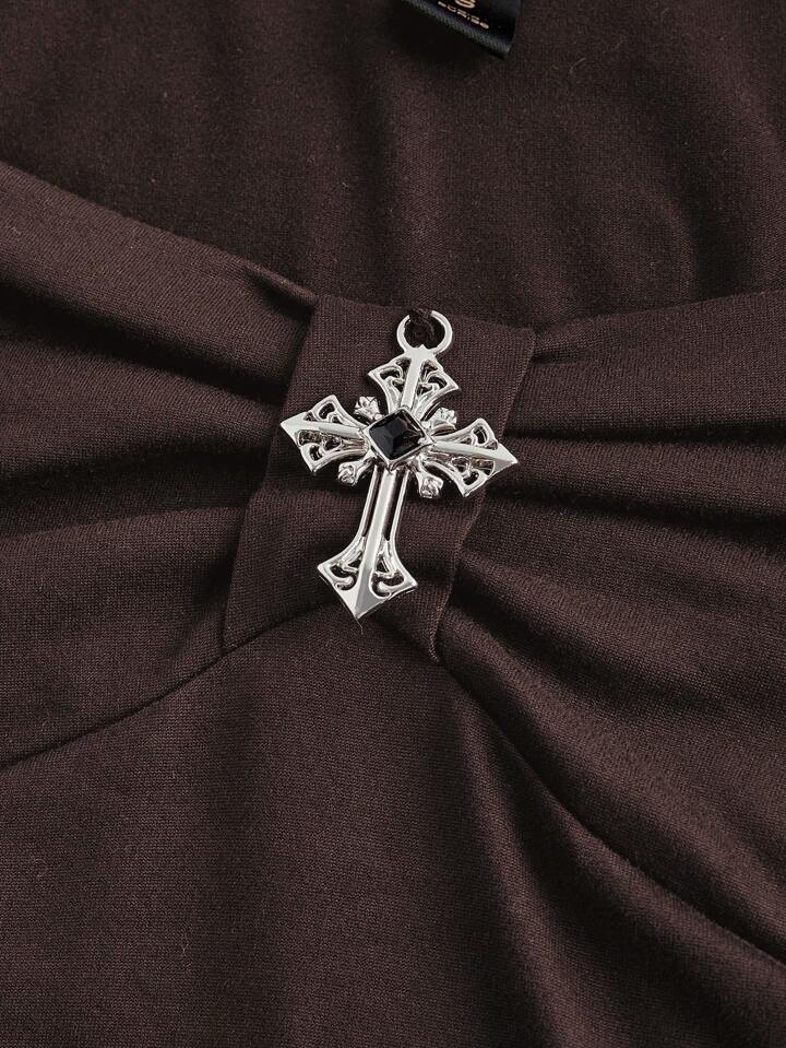 Brown Vintage Gothic Palace Cross Pendant Solid Color Elastic Long Sleeve T-Shirt For Women