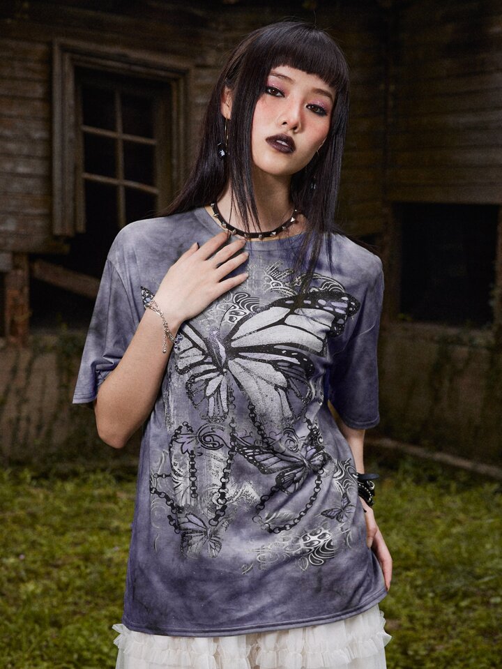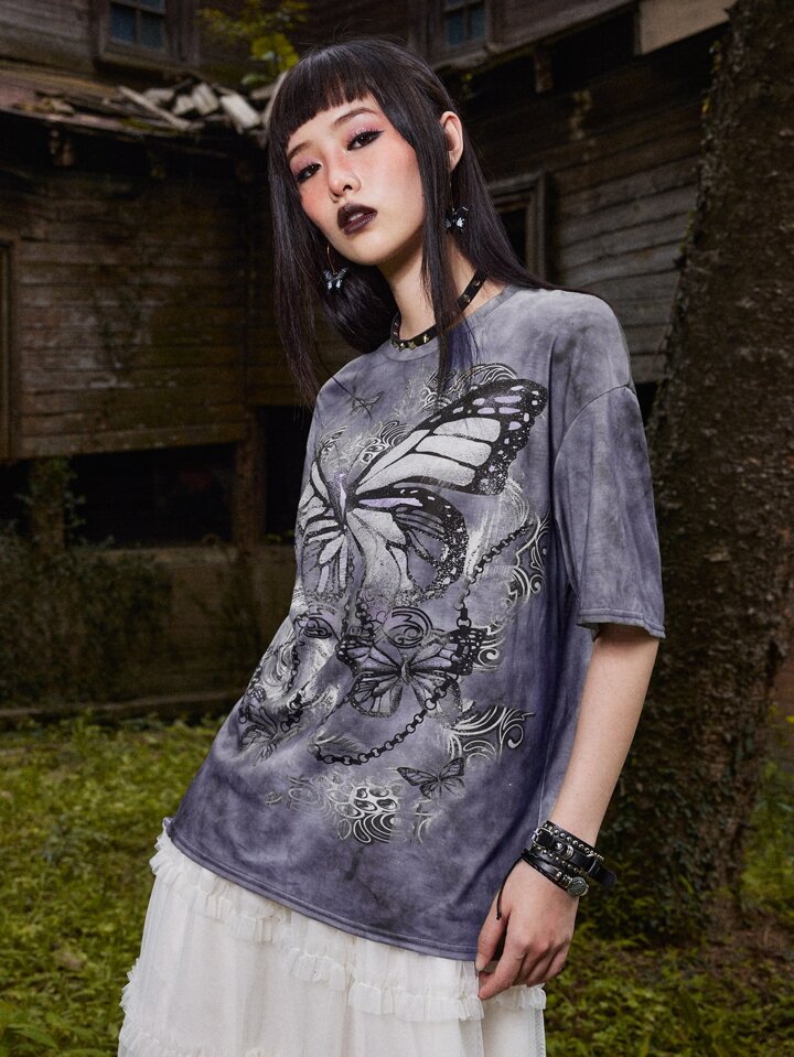 Goth Butterfly Graphic Tie Dye Drop Shoulder Tee