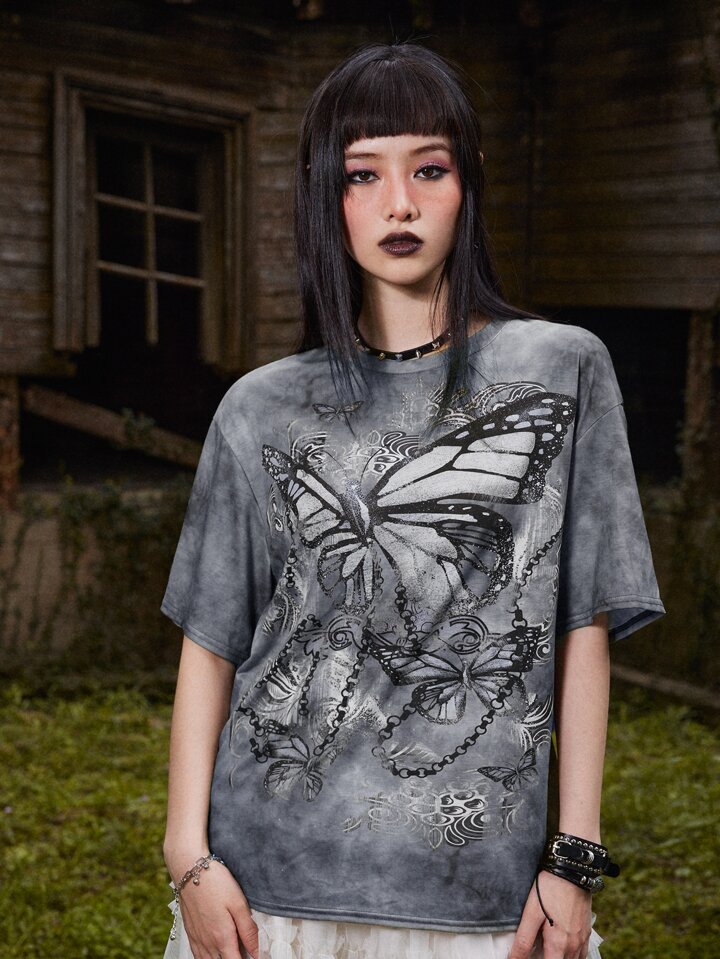 Goth Butterfly Graphic Tie Dye Drop Shoulder Tee