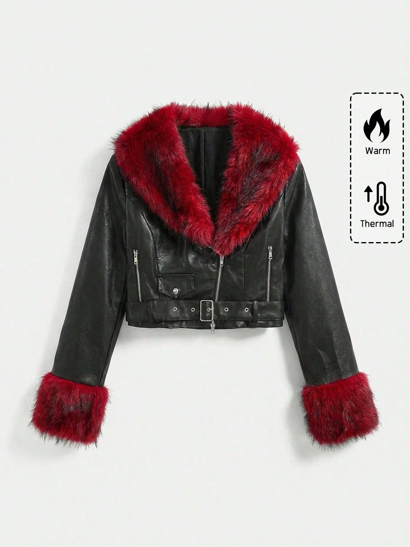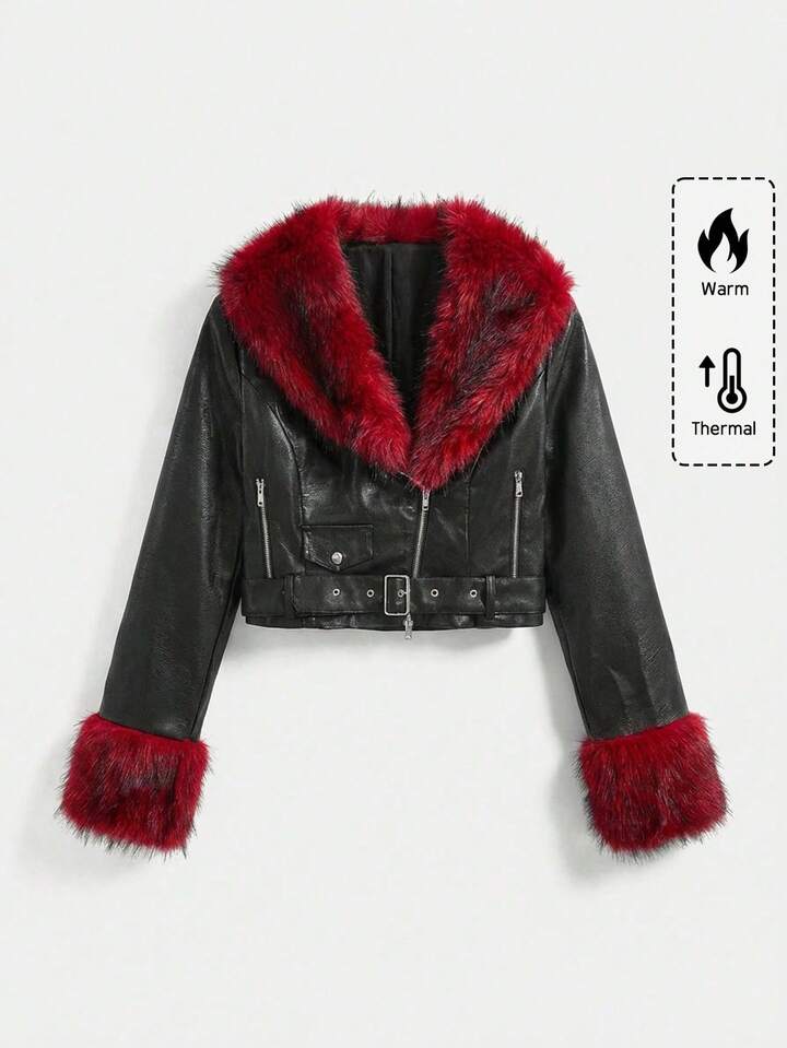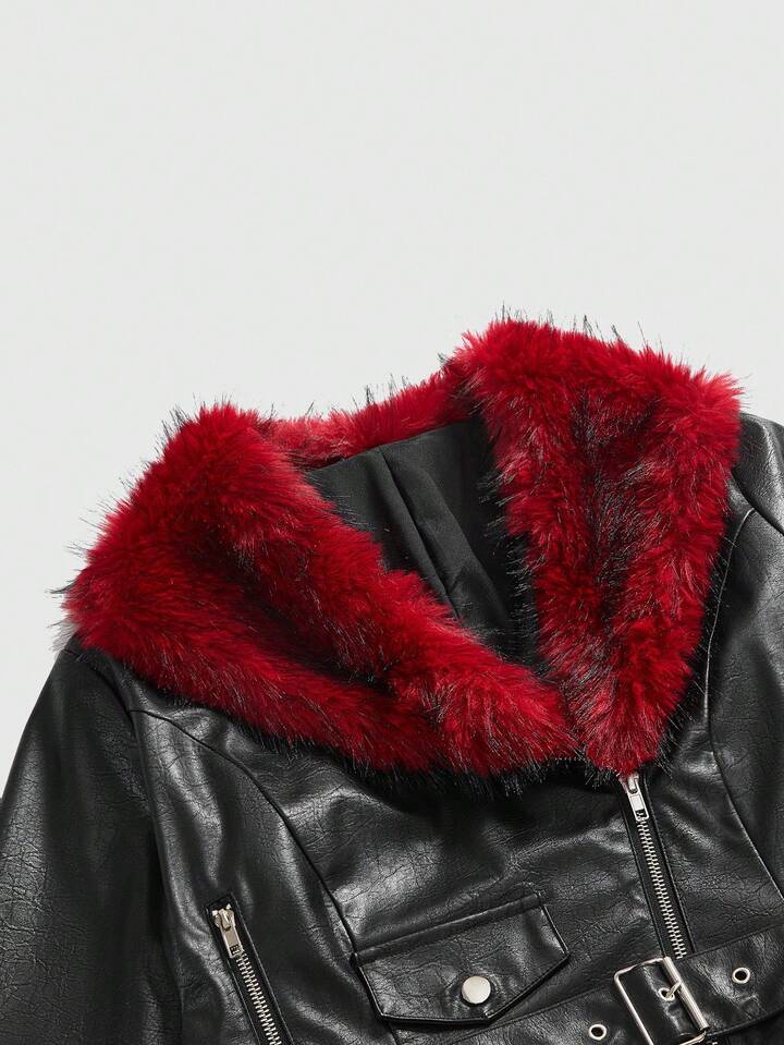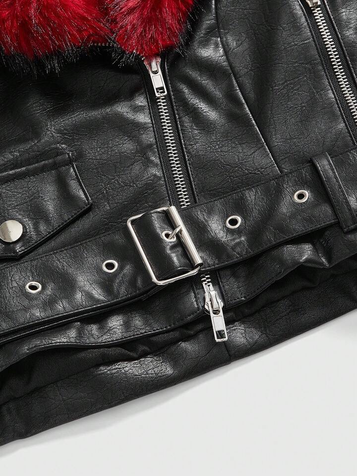Goth Christmas Vintage Grunge-Punk Black Short Faux Leather Jacket With Red Faux Fur Collar, Plus Size Streetwear Fashion Avant-Garde Leather Jacket For Women, Autumn/Winter