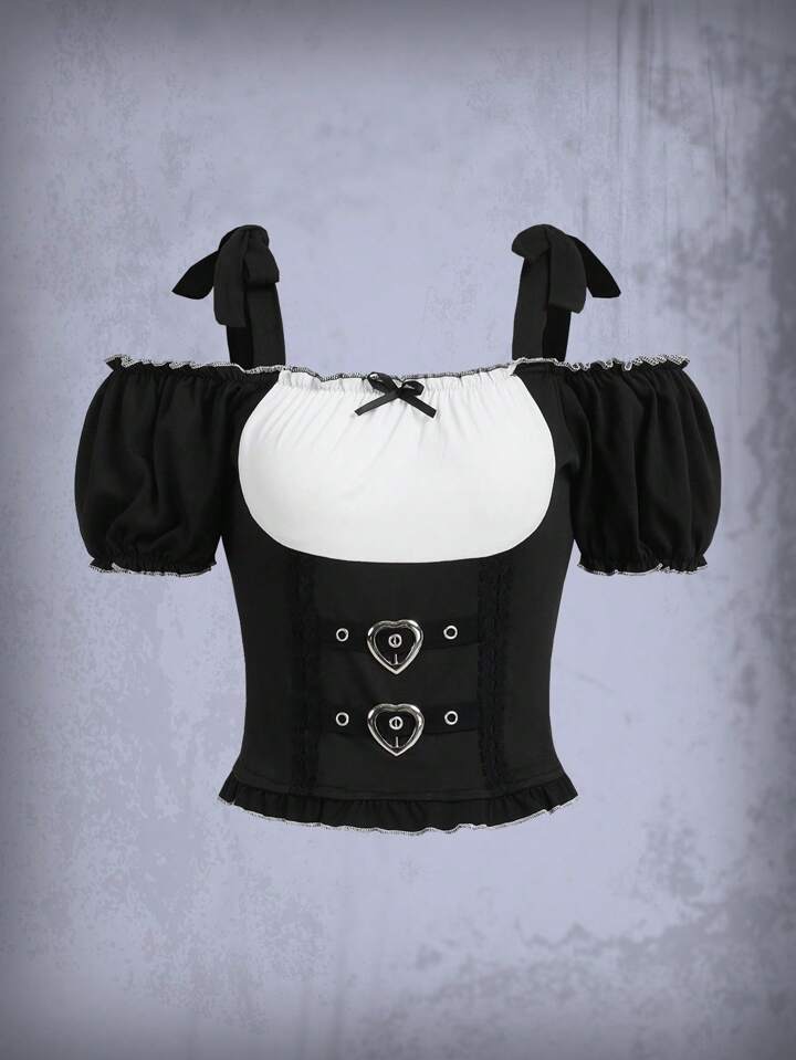 Goth Colorblock Heart-ring Decor Frill Trim Tie Shoulder Top