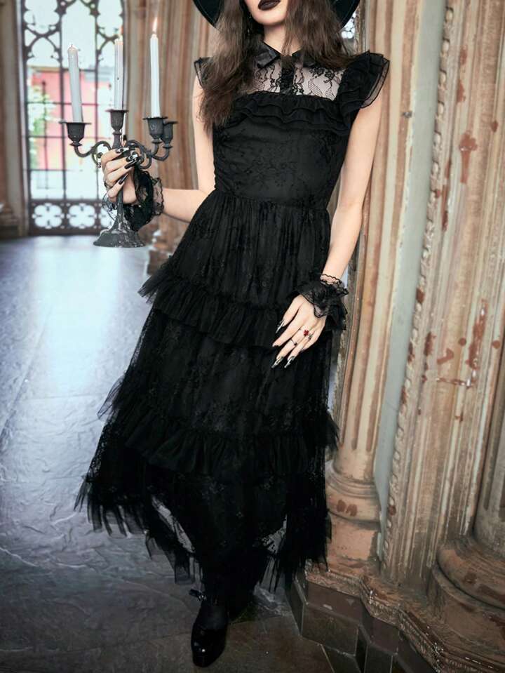 Goth Contrast Lace Ruffle Trim Mesh Dress