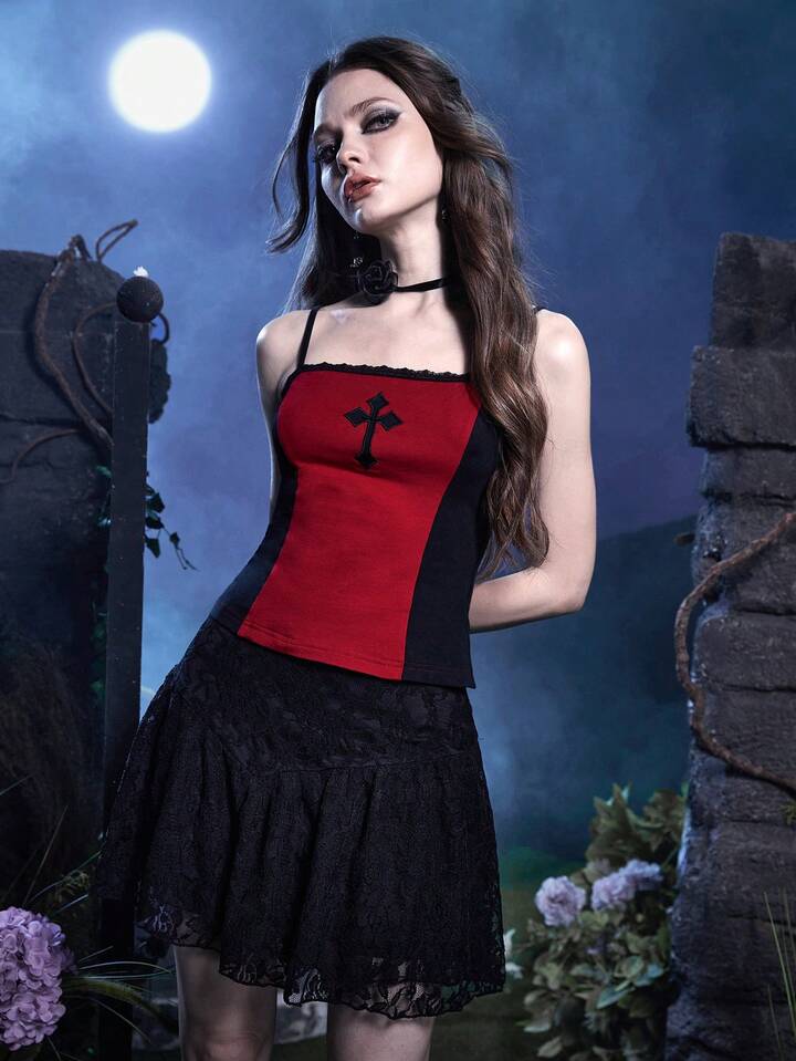 Goth Cross Embroidery Contrast Lace Colorblock Cami Top