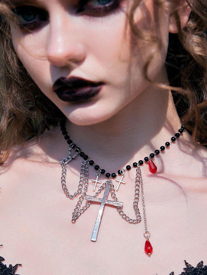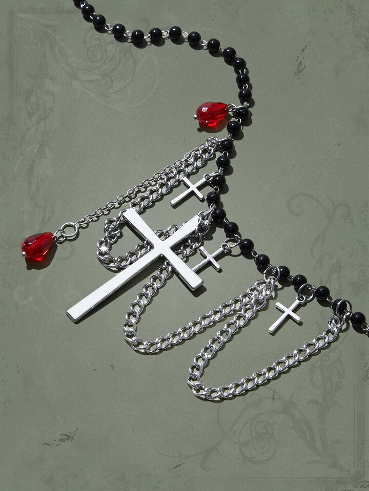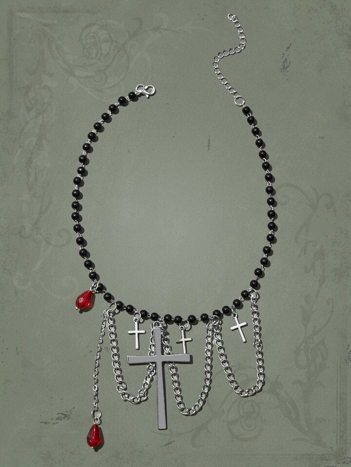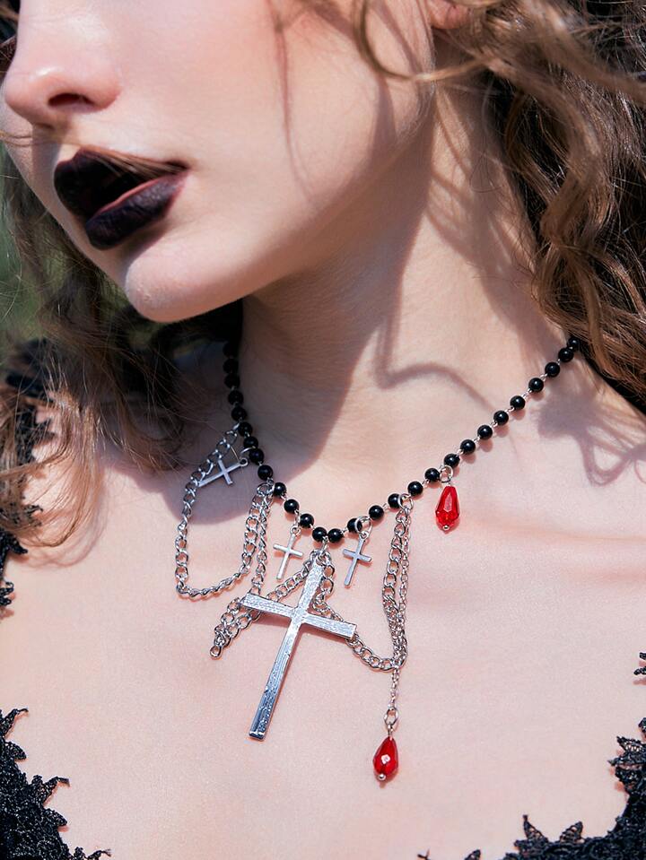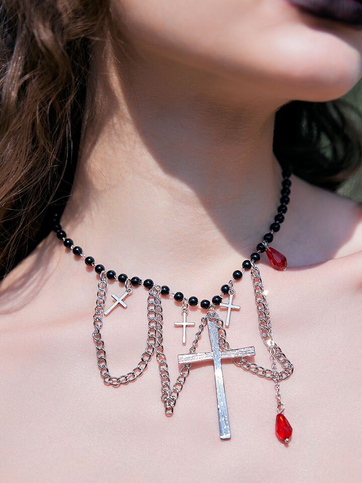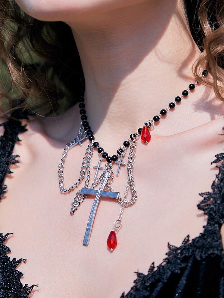 Goth Cross Pendant Beaded Necklace