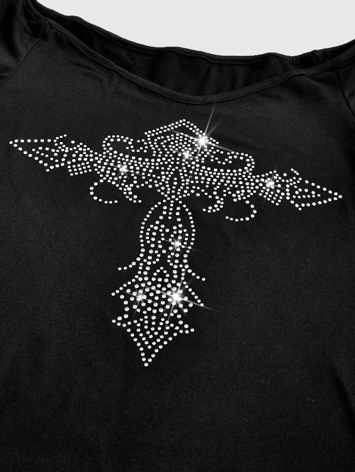 Goth Cross Rhinestone Decor Off The Shoulder Short Sleeve T-Shirt, For Carnival