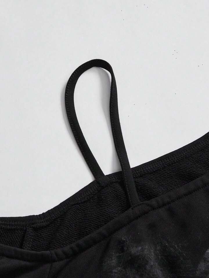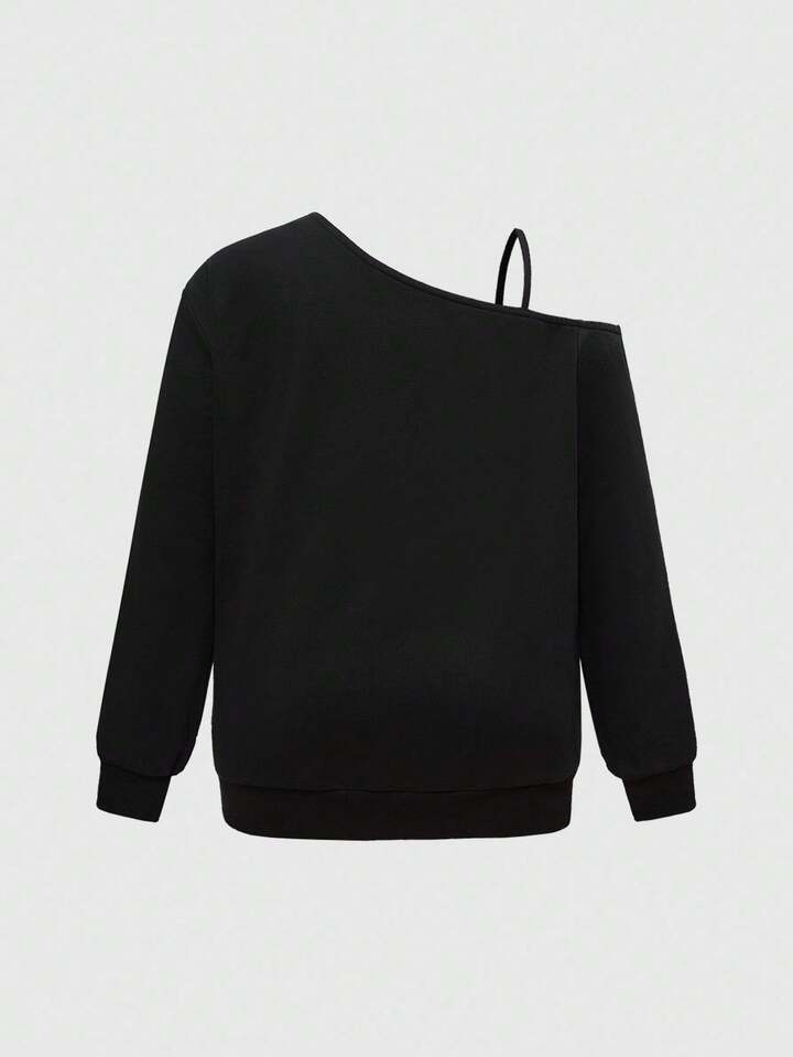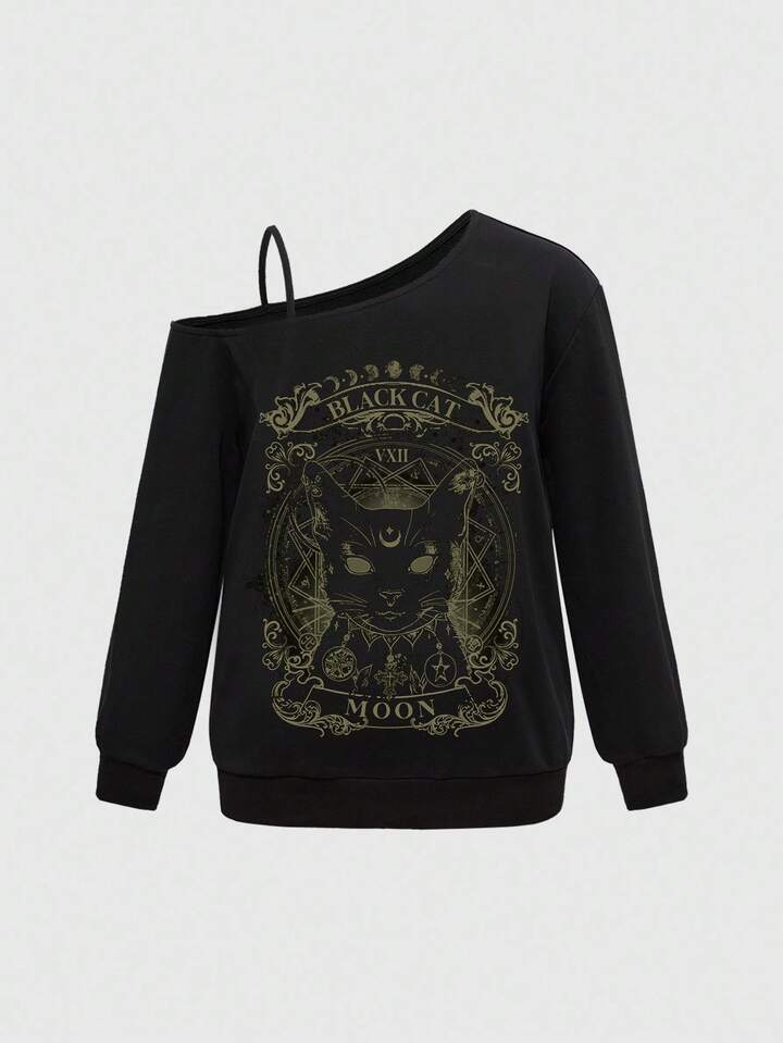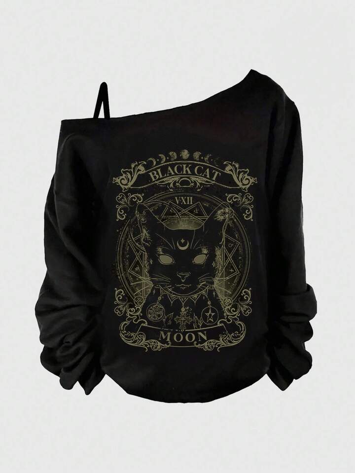 Goth Dark Black Cat Mysterious Loose Fit Asymmetrical Shoulder Sweatshirt For Women