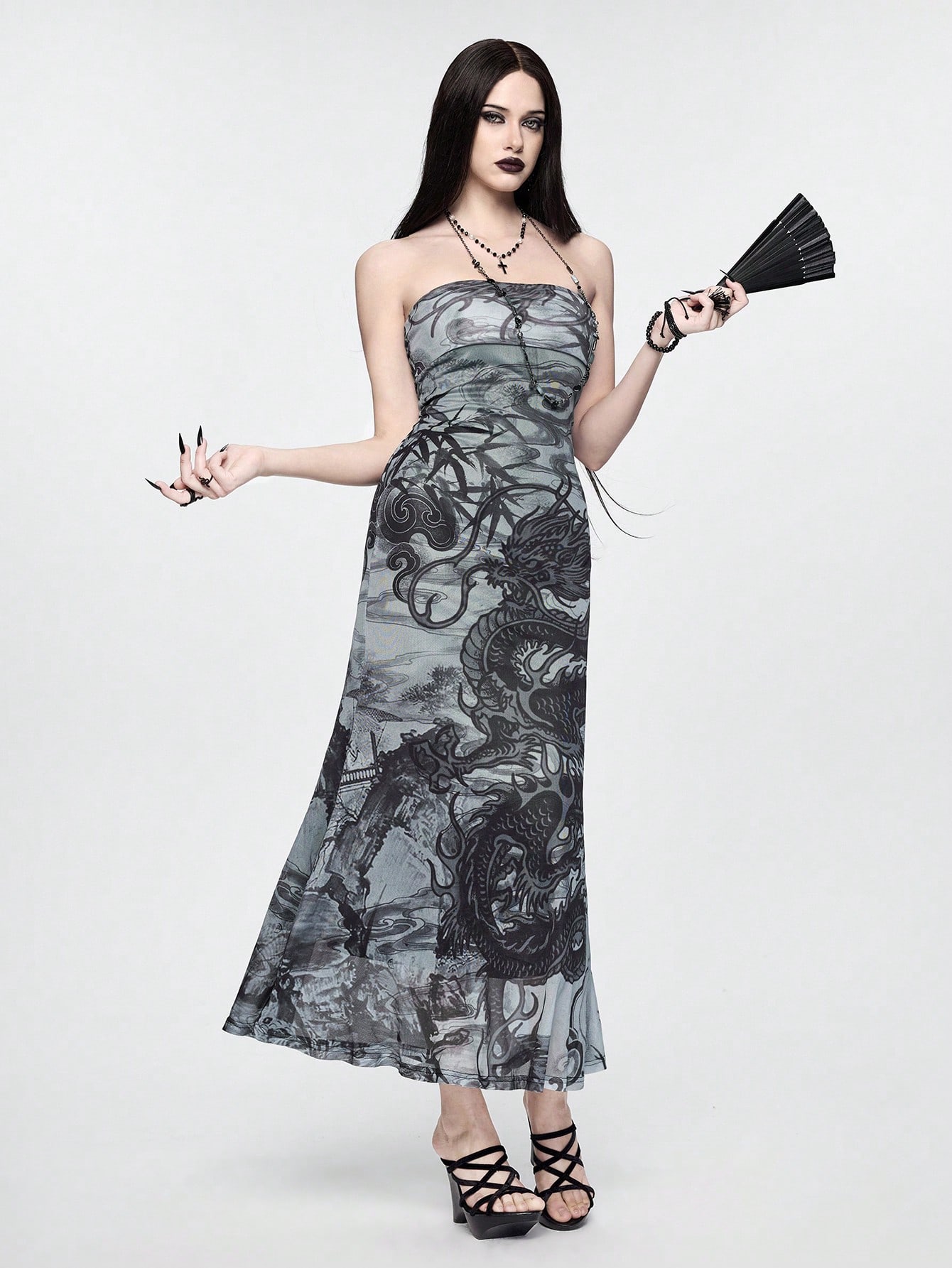 Goth Dark Chinese Style Shanhaijing Dragon Print Fitted Mesh Dress For Women