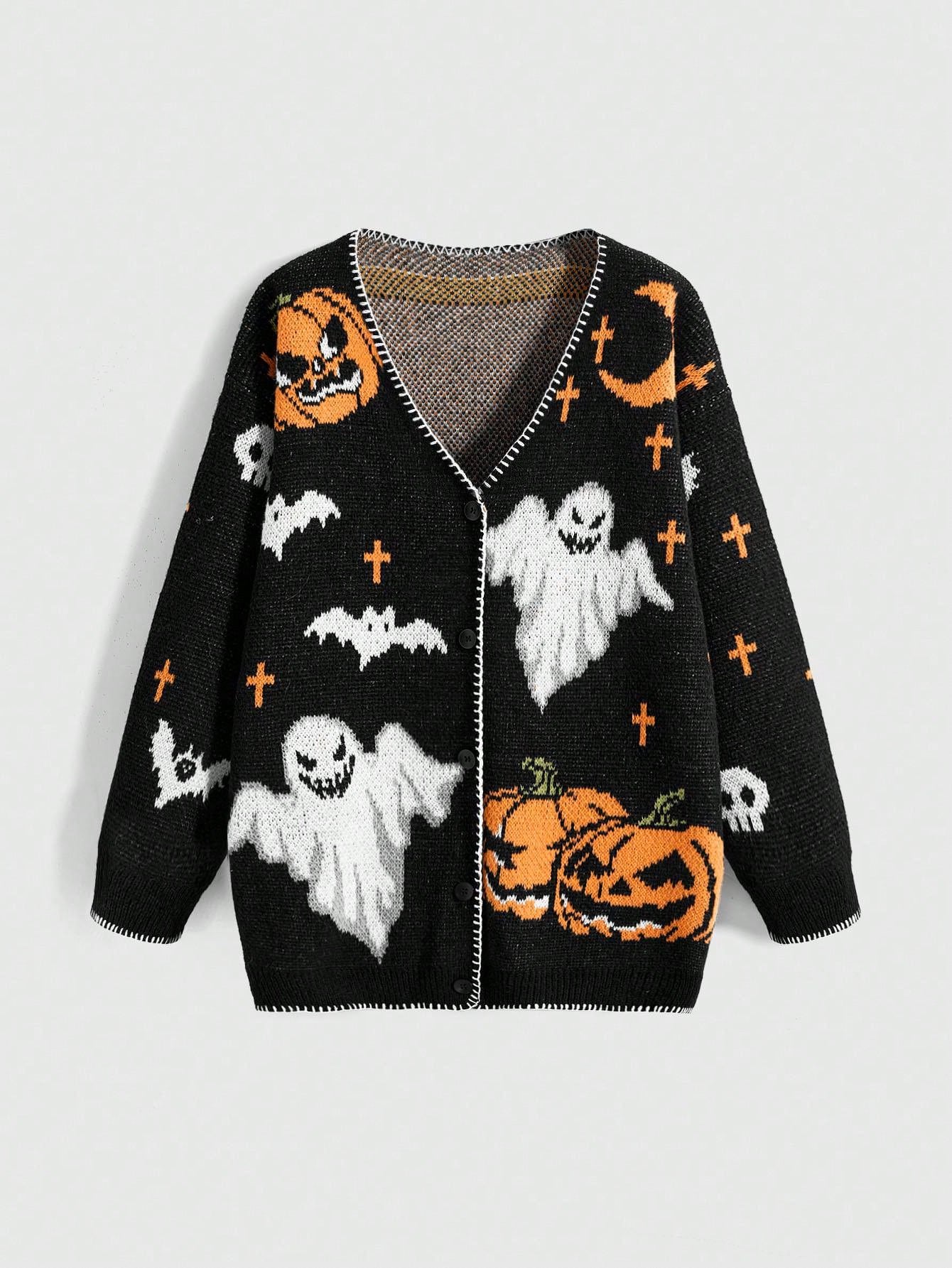 Goth Dark Halloween Pumpkin & Ghost Knit Cardigan