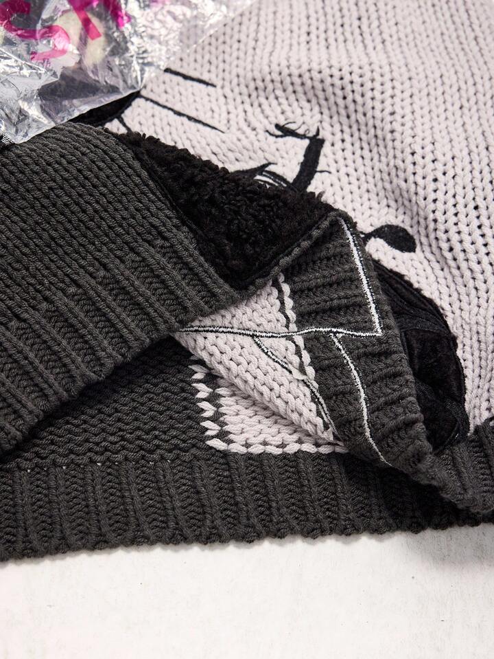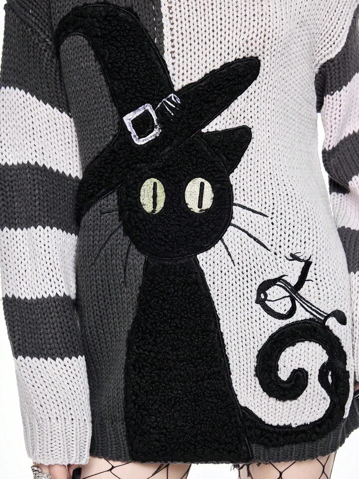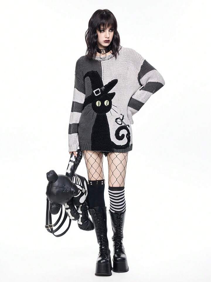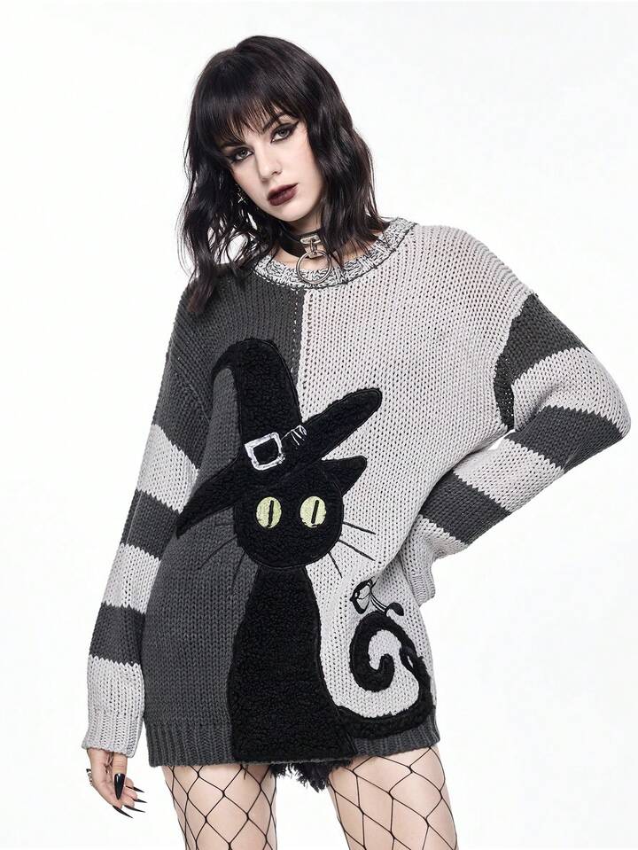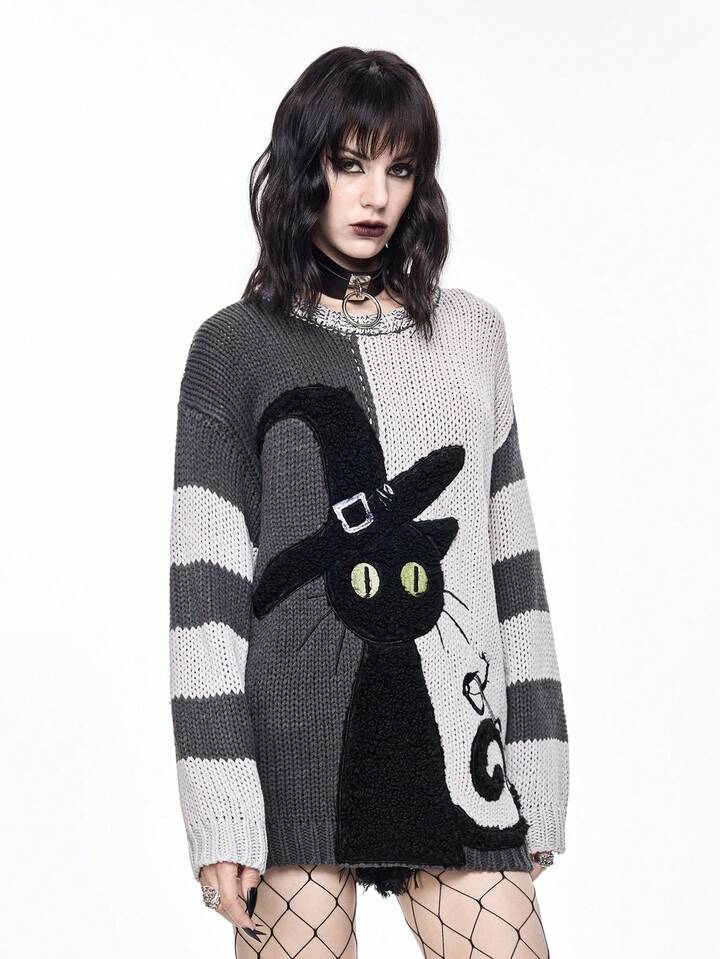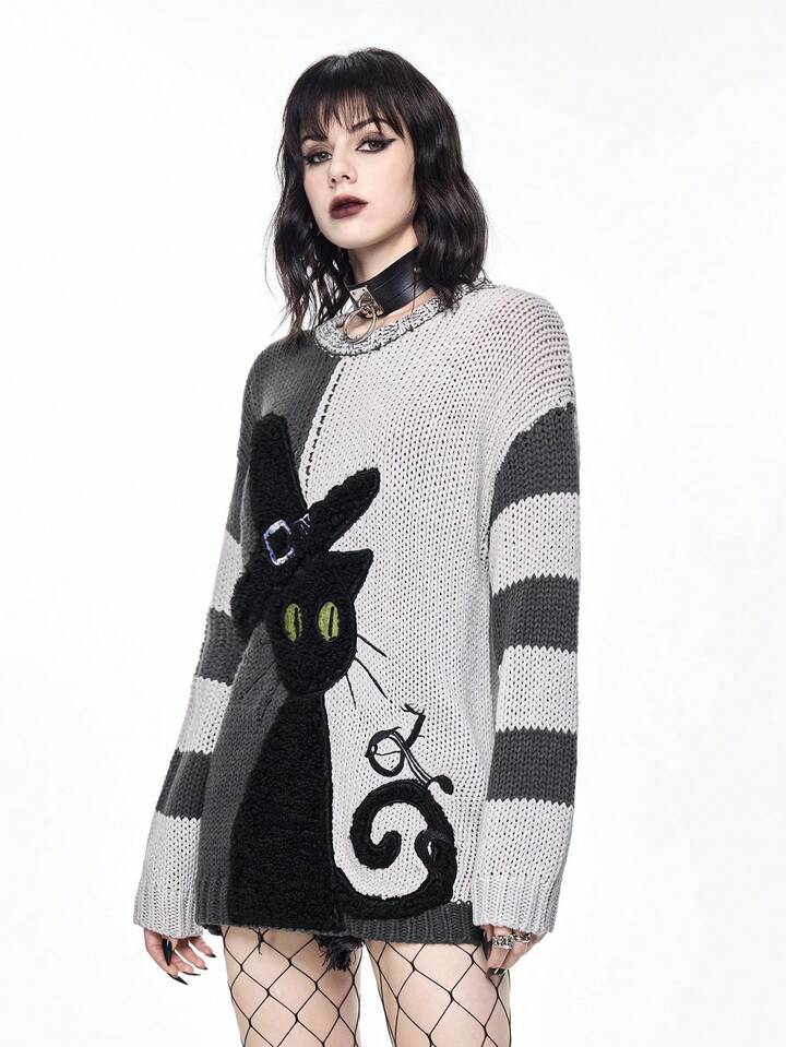 Goth Dark Mysterious Black Cat Intarsia Yin Yang Striped Loose Fit Crew Neck Sweater