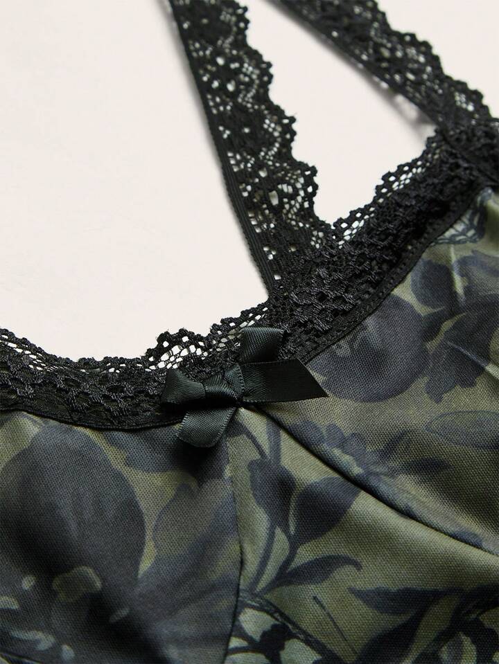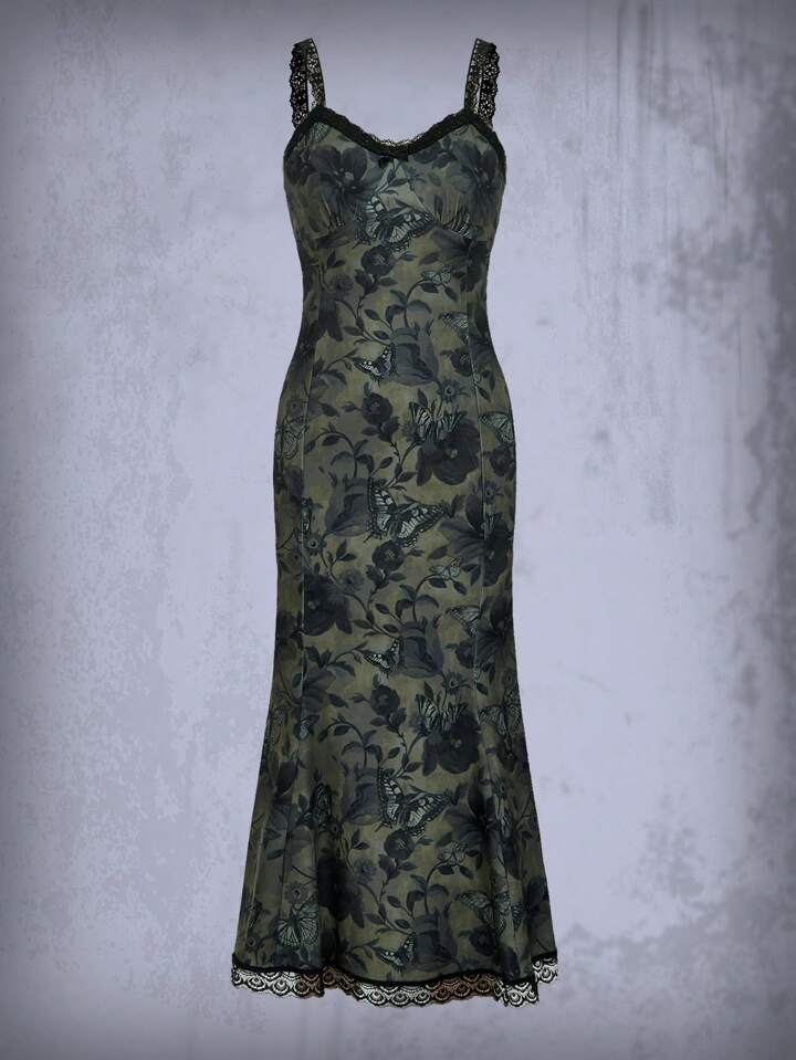 Goth Floral Print Contrast Lace Cami Dress
