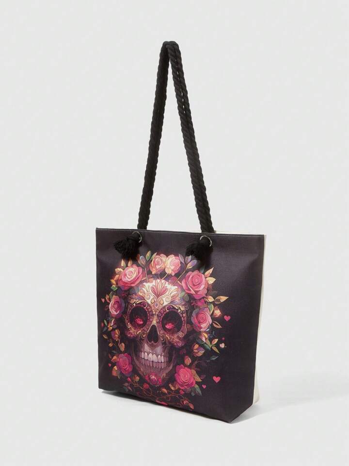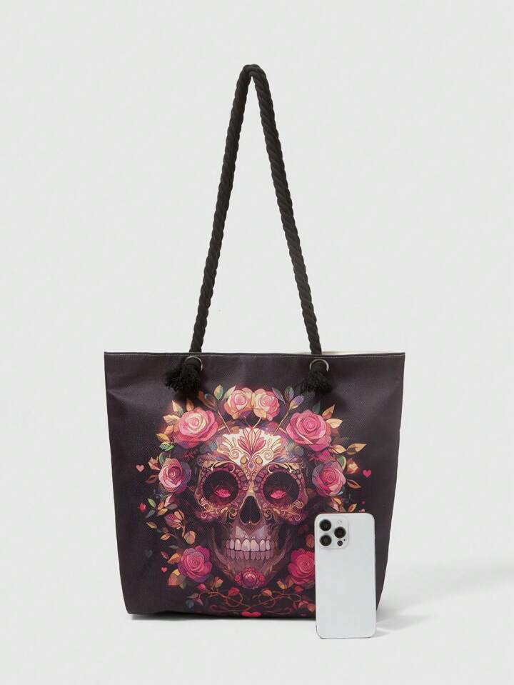 Goth Floral Print Large Capacity Fashion Shoulder Bag, Suitable For Daily Outings