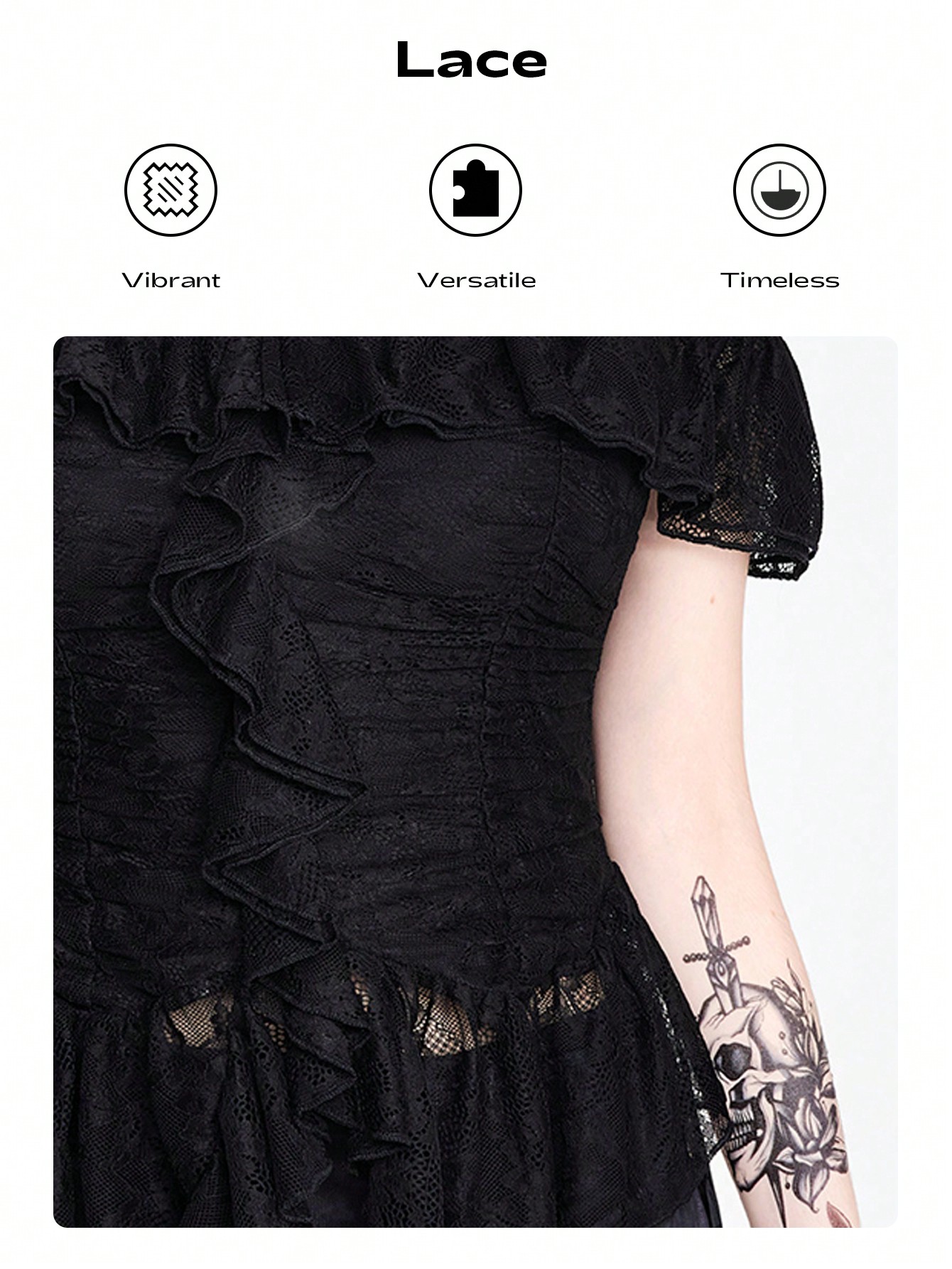 Goth Gorgeous Palace-Style Sexy Lace Halter-Neck Tank Top For Women, Asymmetrical Hemline With Multi-Layer Ruffle Trim To Create A Slimming Effect, Retro Crossed Halter Neckline Design