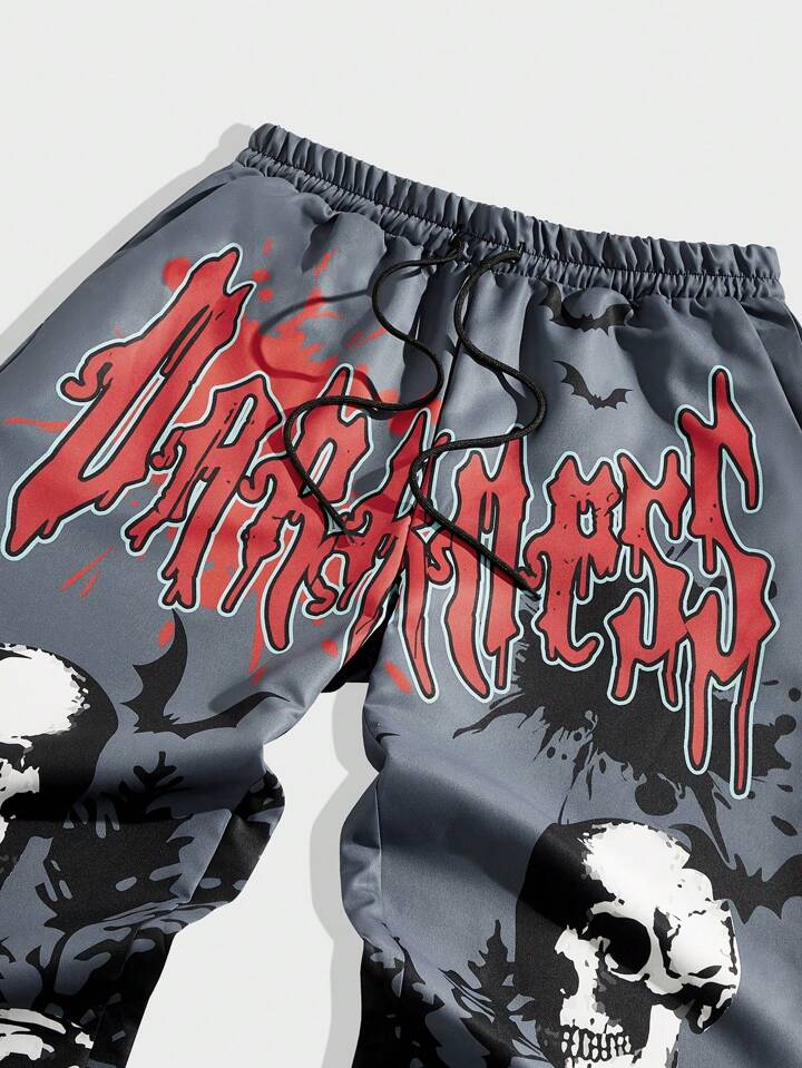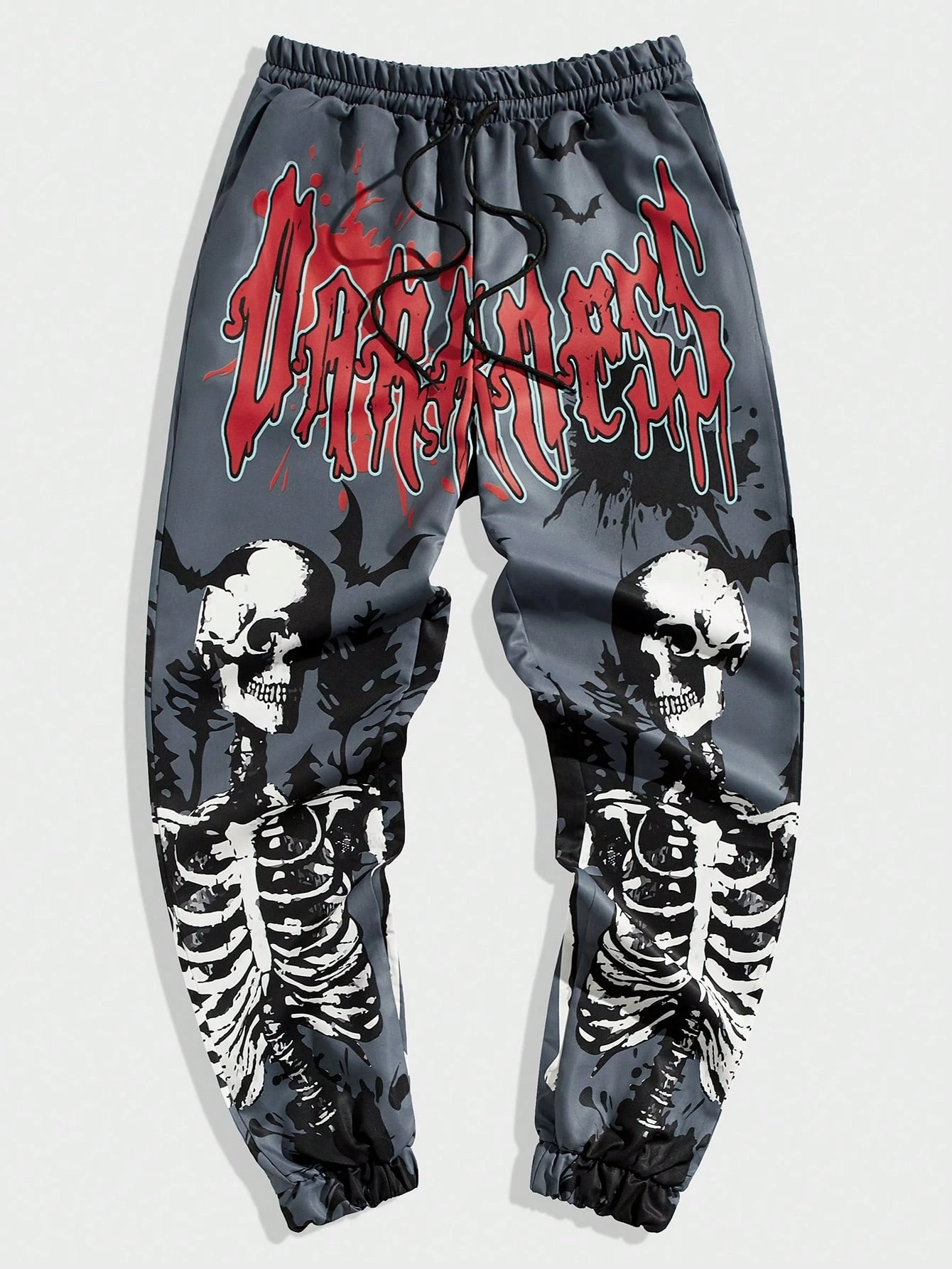 Goth Guys Letter & Skeleton Print Drawstring Waist Pants