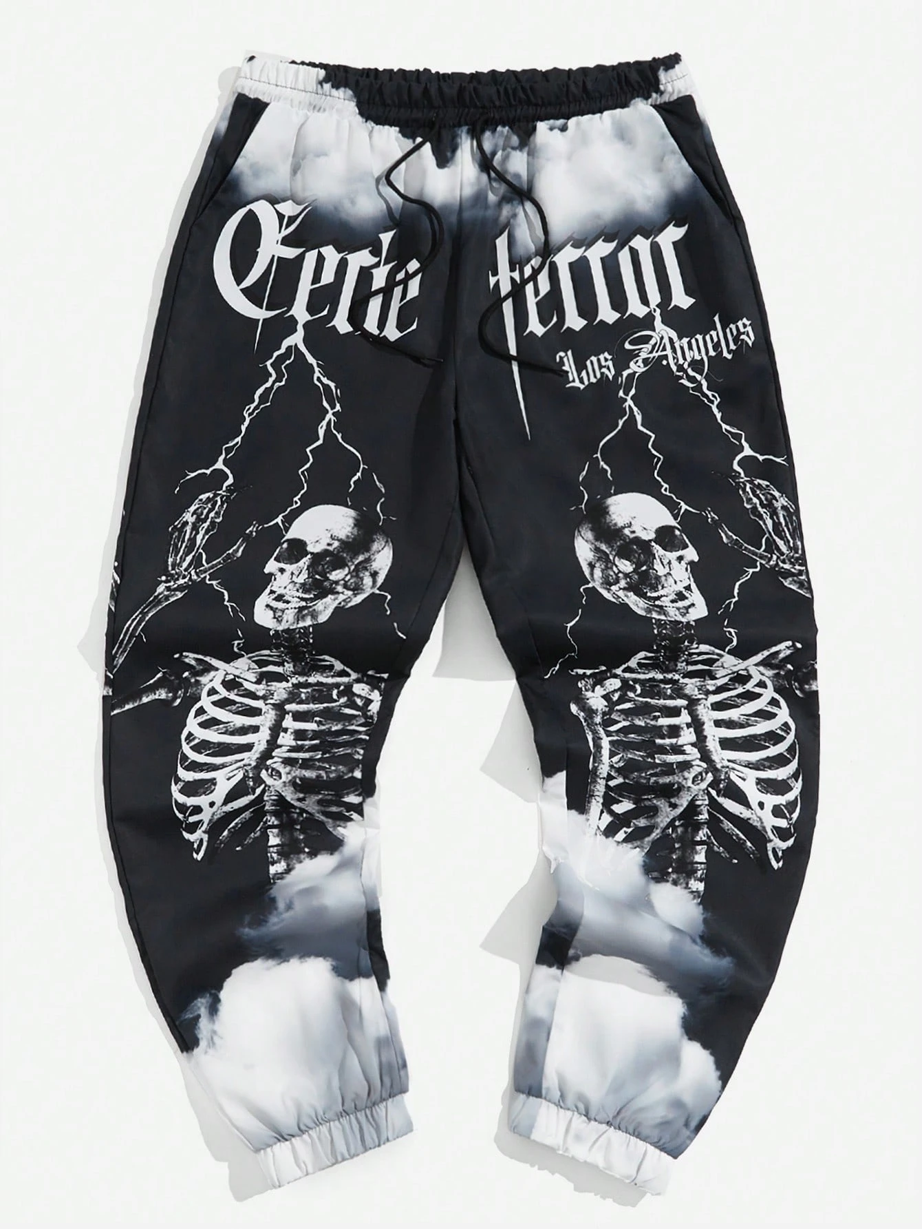 Goth Guys Letter & Skull Print Drawstring Waist Pants