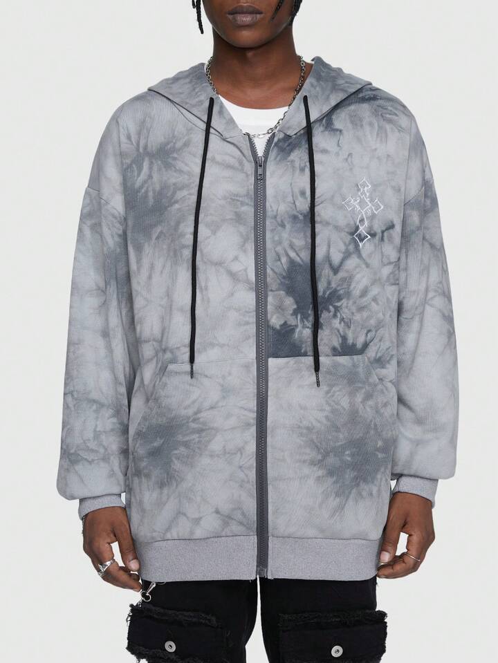 Goth Guys Tie Dye Embroidery Detail Zip Up Drawstring Hoodie