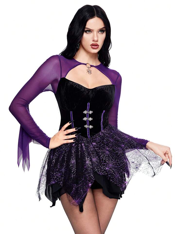 Goth Halloween Cut Out Front Contrast Mesh Witch Cosplay Dress, Women Costume Dress
