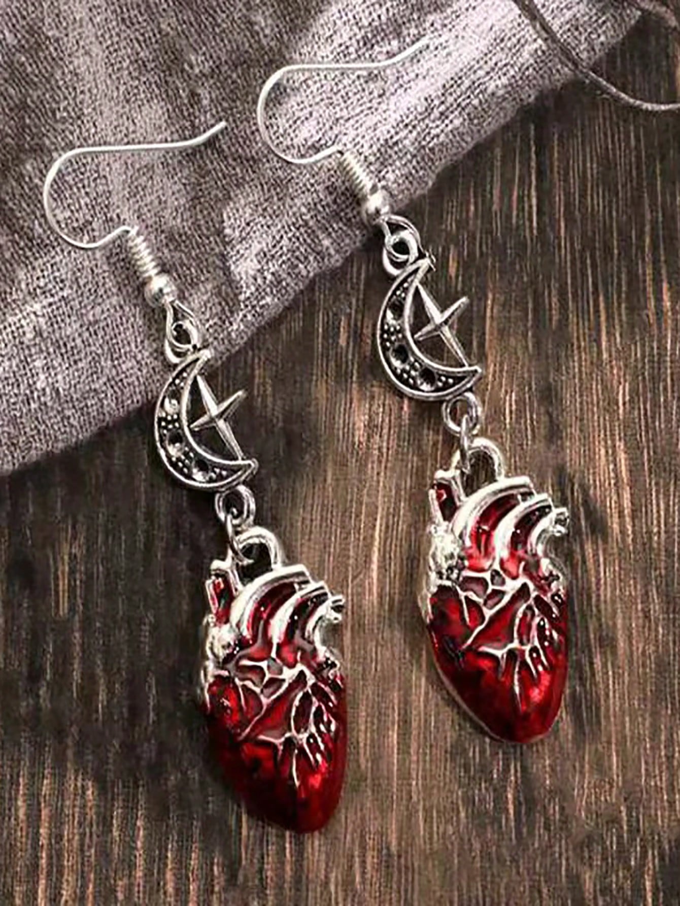 Goth Heart Moon Star & Rhinestone Decorated Drop Earrings