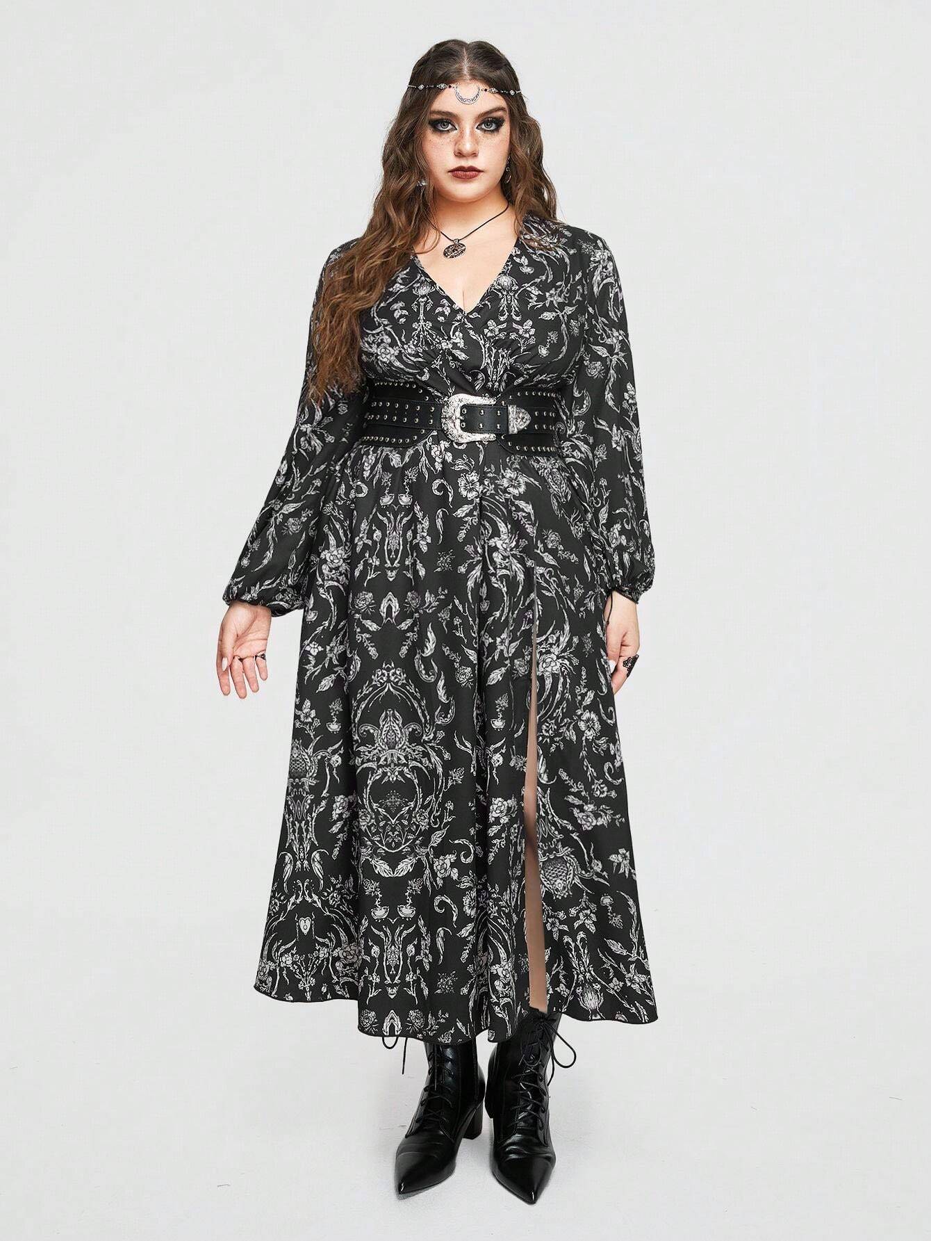 Goth Holiday Style V-Neck Plus Size Women's Long Sleeve Dress With Side Split