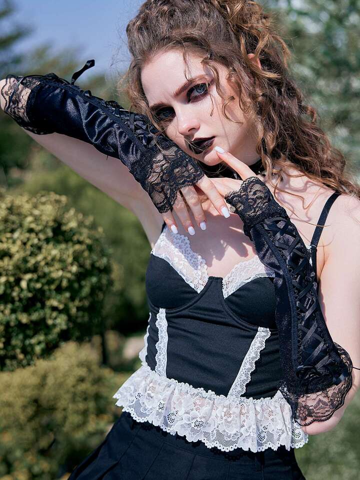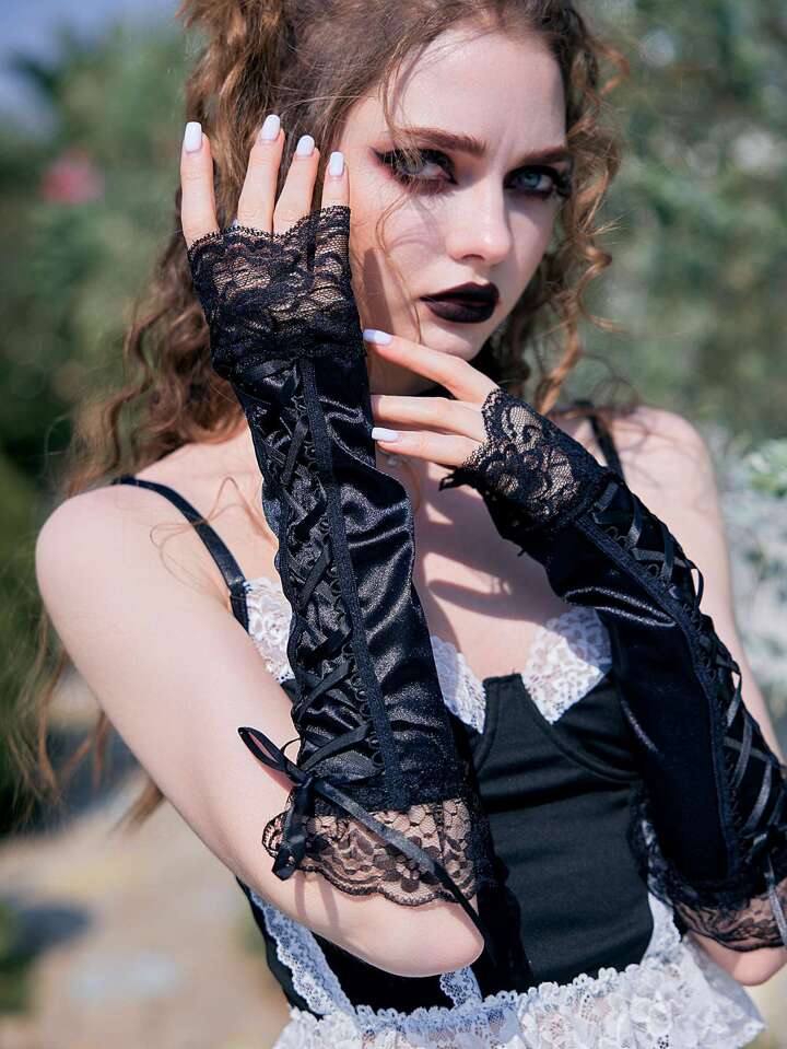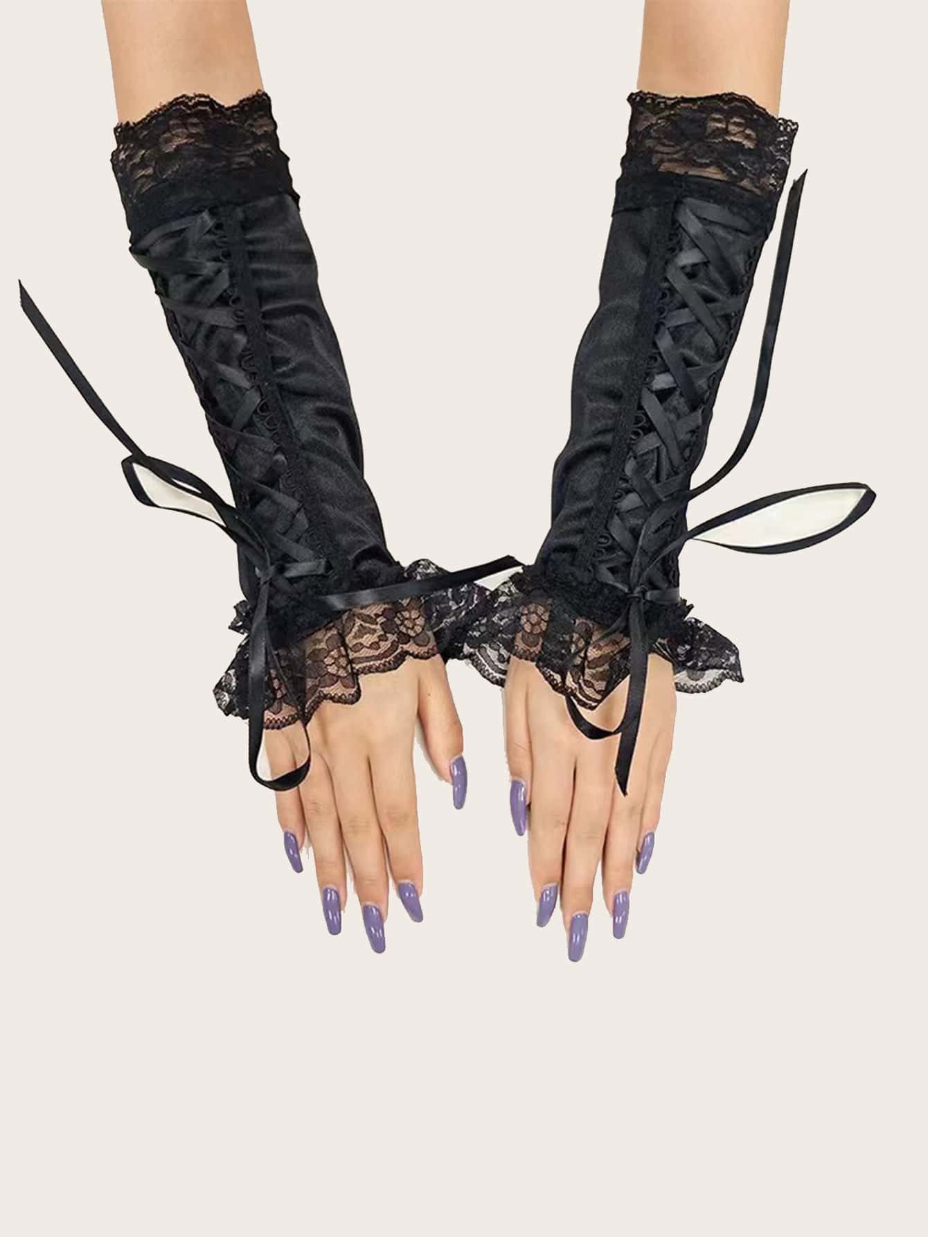 Goth Lace-up Front Lettuce Trim Arm Sleeves