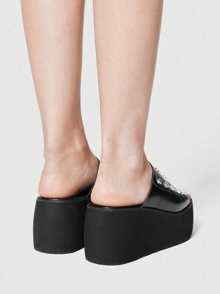 Goth Ladies Buckle Strap Round Toe Platform Wedge High Heel Roman Sandals, PU Material Black Sandals Suitable For Graduation Photos, Casual Wear
