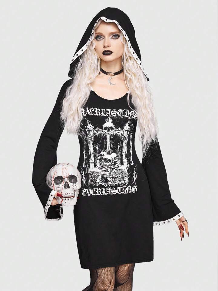 Goth Letter & Skull Graphic Flare Sleeve Hooded Dress