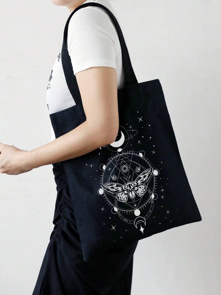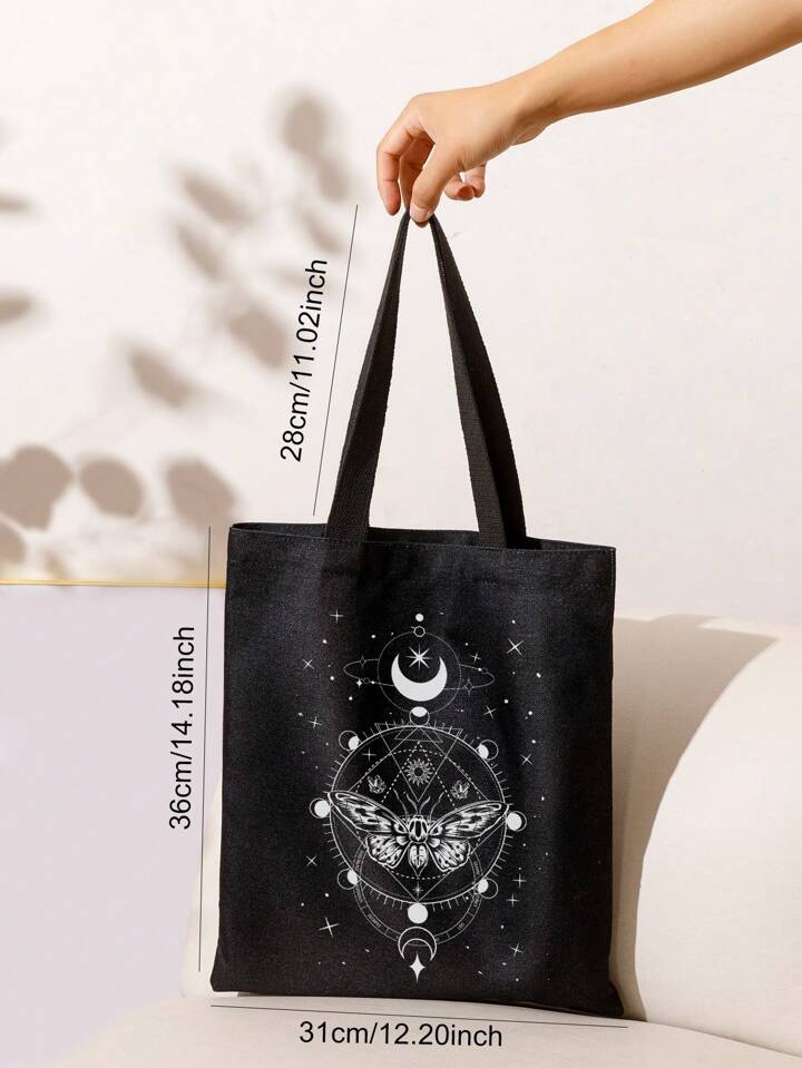 Goth Medium Shopper Bag Casual Butterfly & Moon Graphic For Shopping
